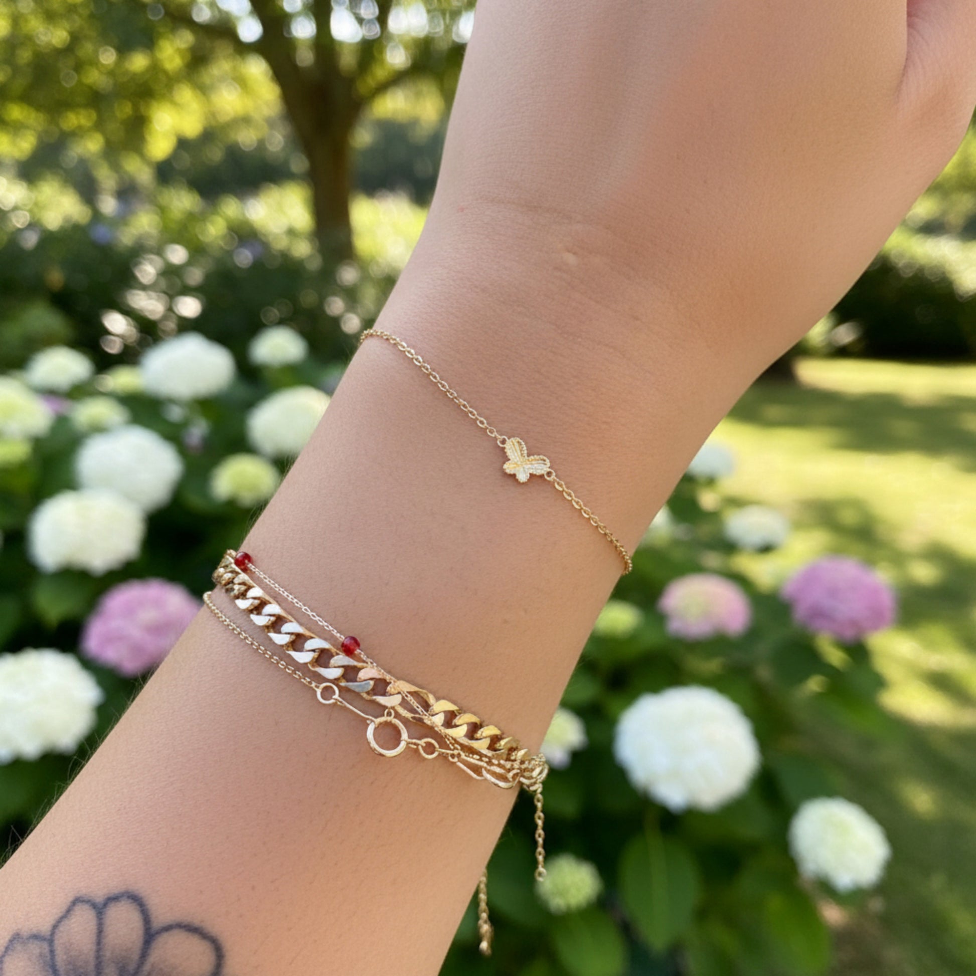 This exquisite 14K gold bracelet showcases delicate laser-cut designs featuring a flower and butterfly and round shape pendant. Each element is meticulously crafted to capture light beautifully, creating an understated yet refined aesthetic. The minimal design approach allows the intricate detailing and lustrous gold finish to take center stage, making it an ideal choice for those who appreciate sophisticated jewelry that transitions seamlessly from everyday wear to special occasions. A timeless piece that celebrates both artistry and elegance.