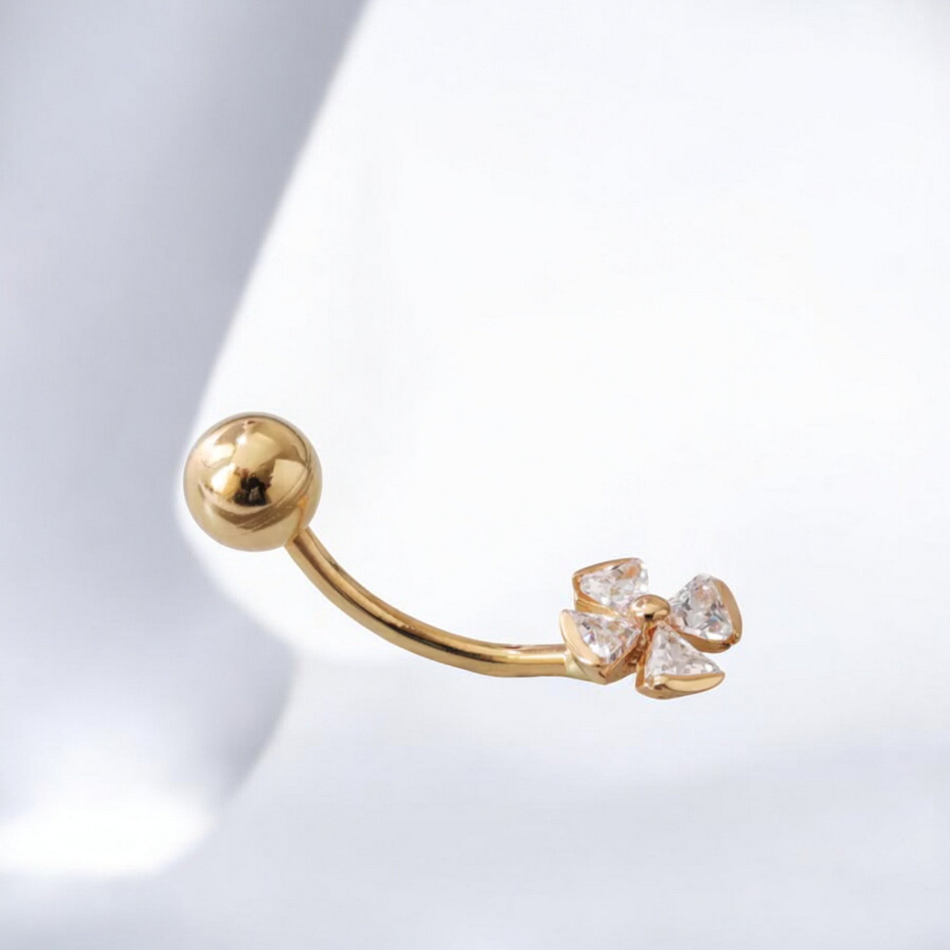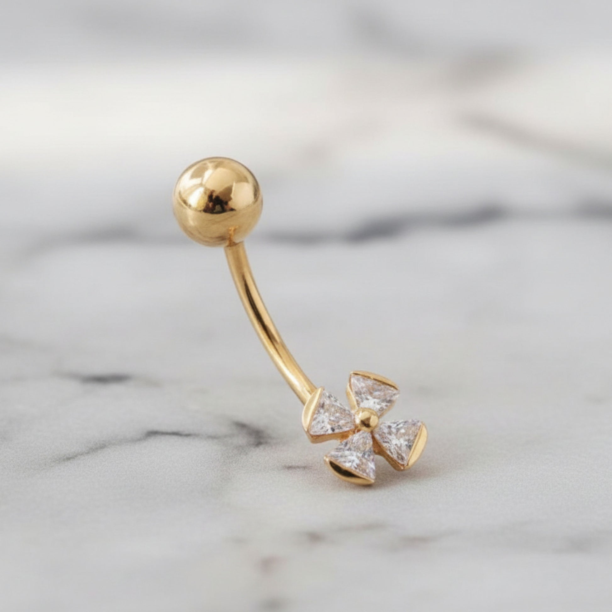 Elevate your body jewelry collection with this sophisticated 14K real gold belly button ring, crafted for those who appreciate genuine luxury. The screw-on design ensures secure, comfortable wear throughout your day, while the delicate four-leaf clover motif adds an elegant touch of charm. Adorned with sparkling cubic zirconia stones that catch the light beautifully, this piece combines timeless style with reliable construction. Perfect for both everyday wear and special occasions, it's a versatile addition to your piercing jewelry that speaks to refined taste and quality craftsmanship.
