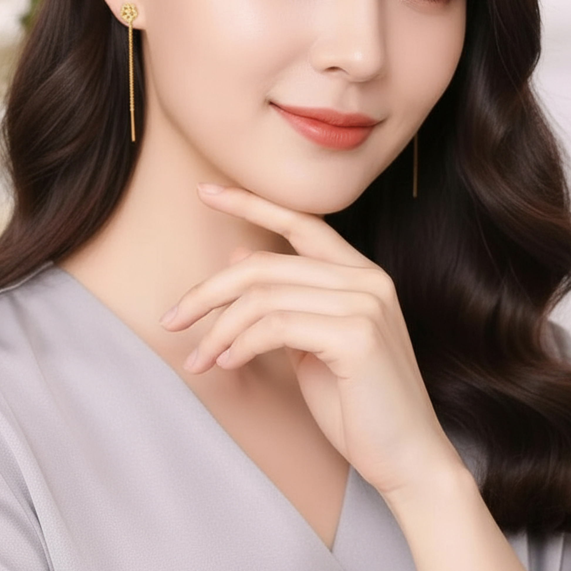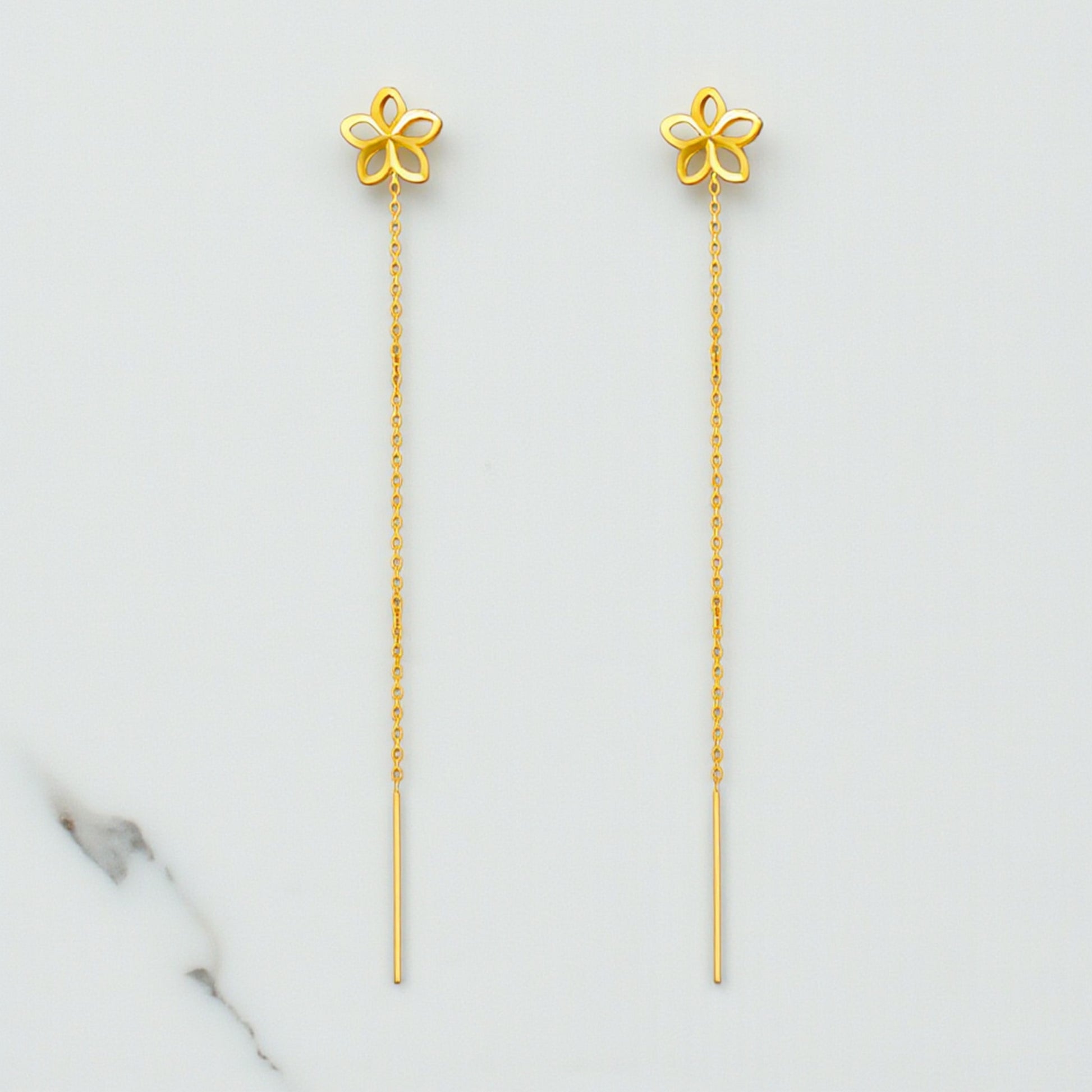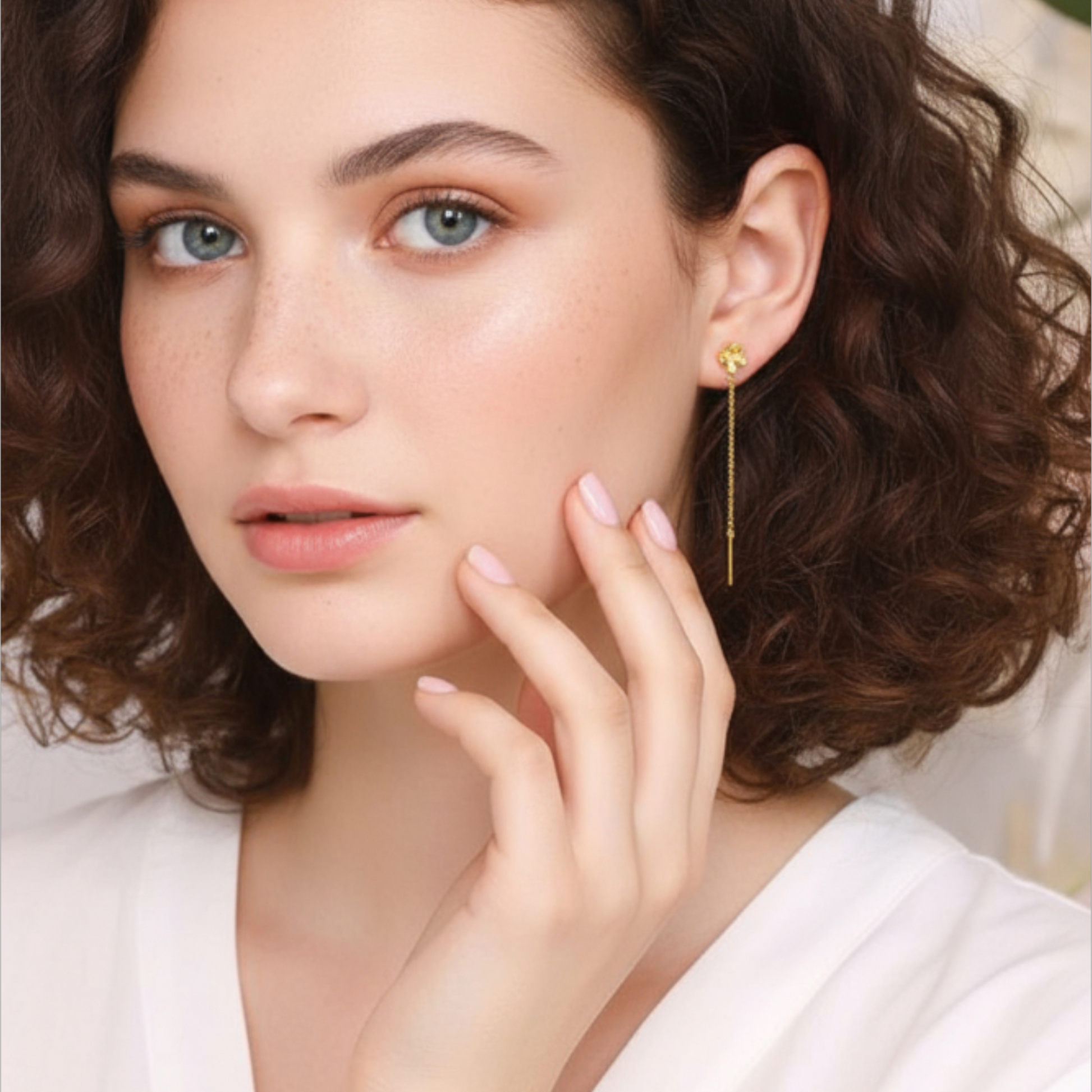 Elevate your jewelry collection with these exquisite 24K authentic pure gold threader earrings, where timeless elegance meets contemporary design. Each piece features a delicate lucky clover flower charm suspended from a graceful chain that threads through the ear for a sophisticated, understated look. Crafted from genuine 24K gold, these earrings offer lasting durability and a radiant finish that complements any complexion. The lightweight threader design ensures all-day comfort, while the symbolic clover charm adds a touch of fortune and charm to your everyday style or special occasions. A refined choice for those who appreciate quality craftsmanship and meaningful accessories.