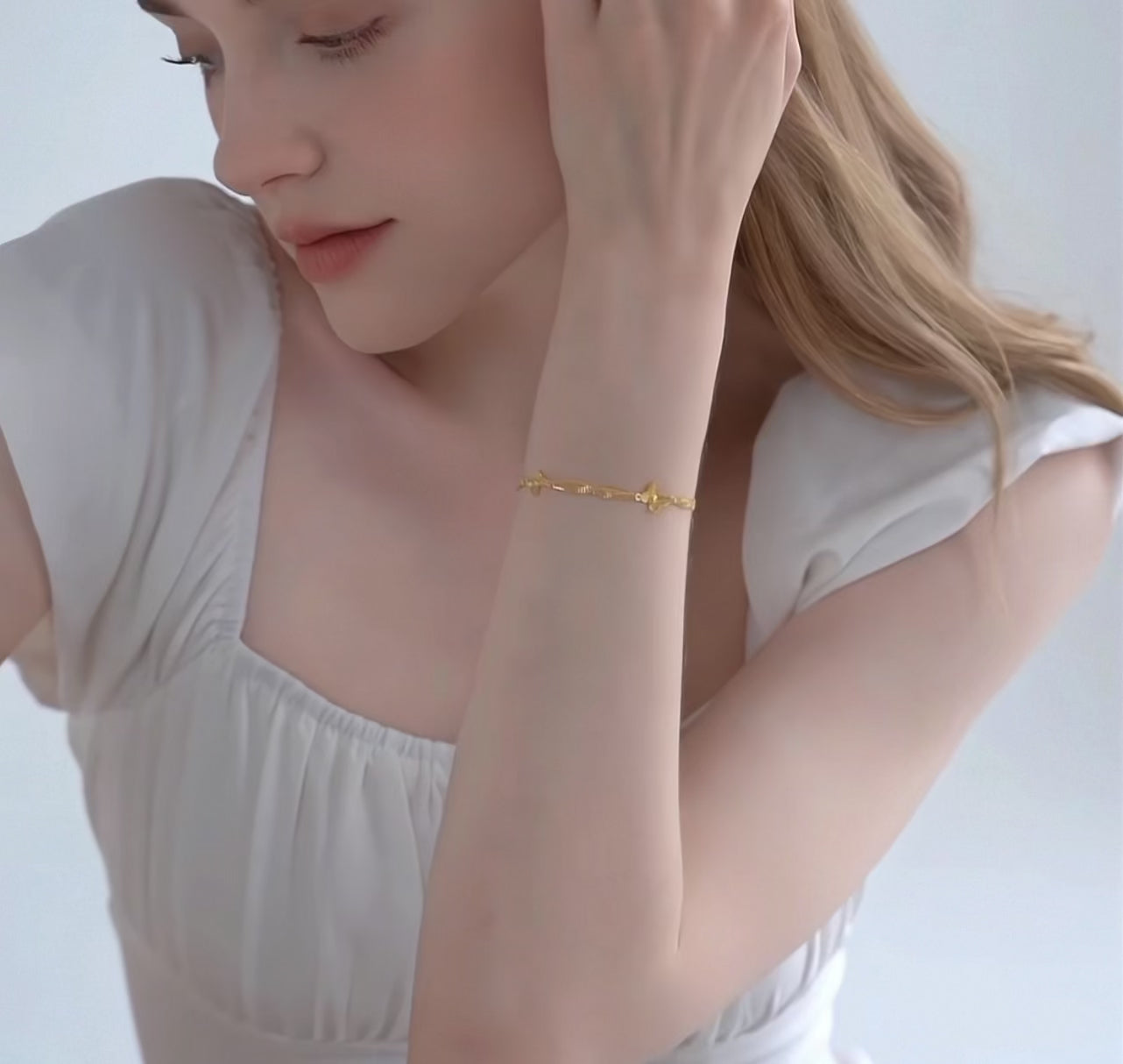 Elevate your jewelry collection with this 18K Real Gold Double Chain and Link Butterfly Charm Bracelet. Expertly crafted, it features intertwined double chains and a delicate butterfly charm, combining strength with intricate elegance. The premium 18K gold offers lasting shine and durability, making it versatile for daily wear or special occasions. This bracelet adds a refined, graceful touch to any outfit while reflecting timeless sophistication.