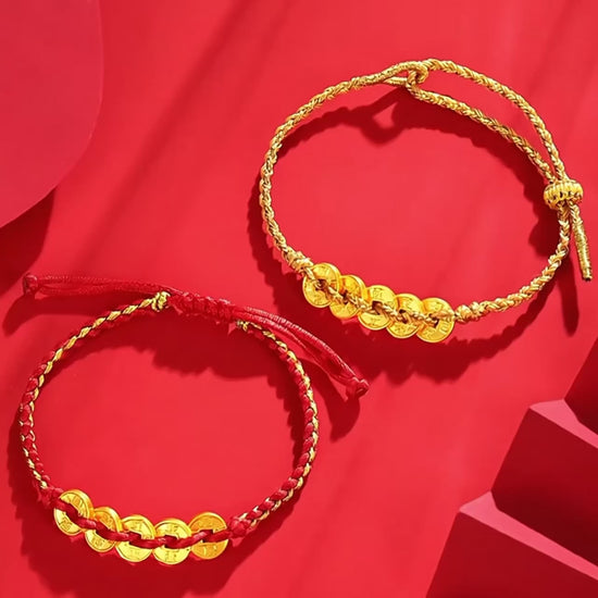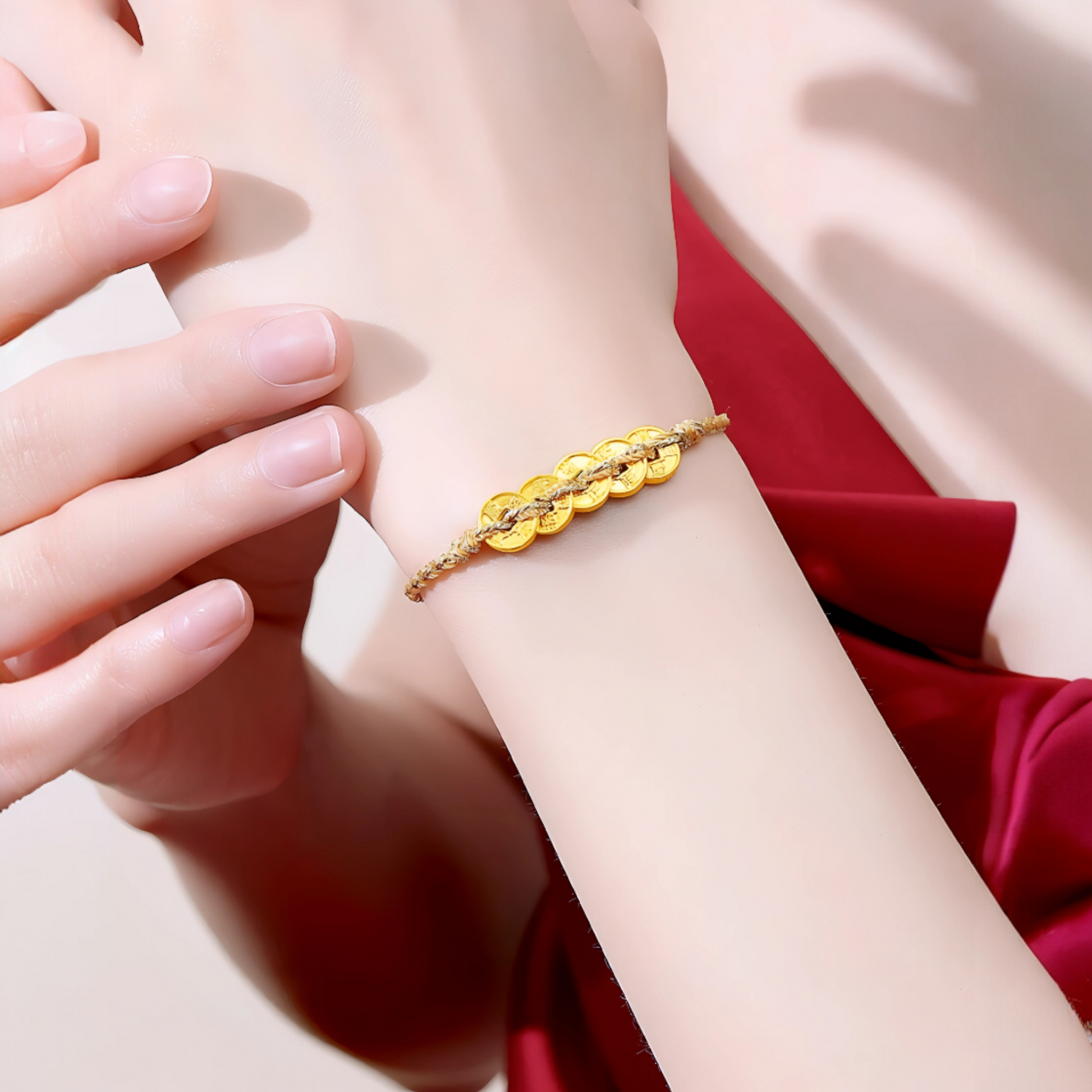 This exquisite bracelet features five authentic 24K 999 gold emperor coins, each meticulously selected for their historical significance and craftsmanship. The coins are secured with a traditional red rope braided string, symbolizing prosperity and good fortune in Chinese culture. The pure gold composition ensures lasting value and durability, while the adjustable design accommodates various wrist sizes. Perfect for collectors seeking genuine precious metal jewelry with cultural heritage, this piece combines timeless elegance with investment-grade materials.