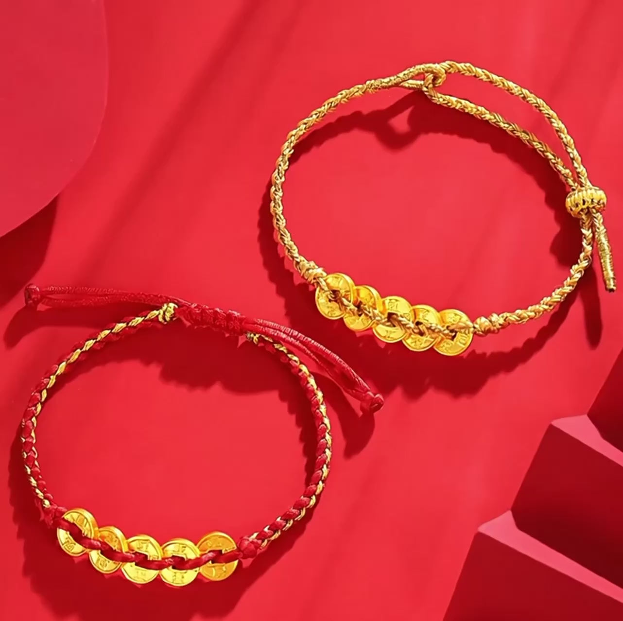 24K 999 Gold Five Emperor Coins with Red Rope Braided String Bracelet