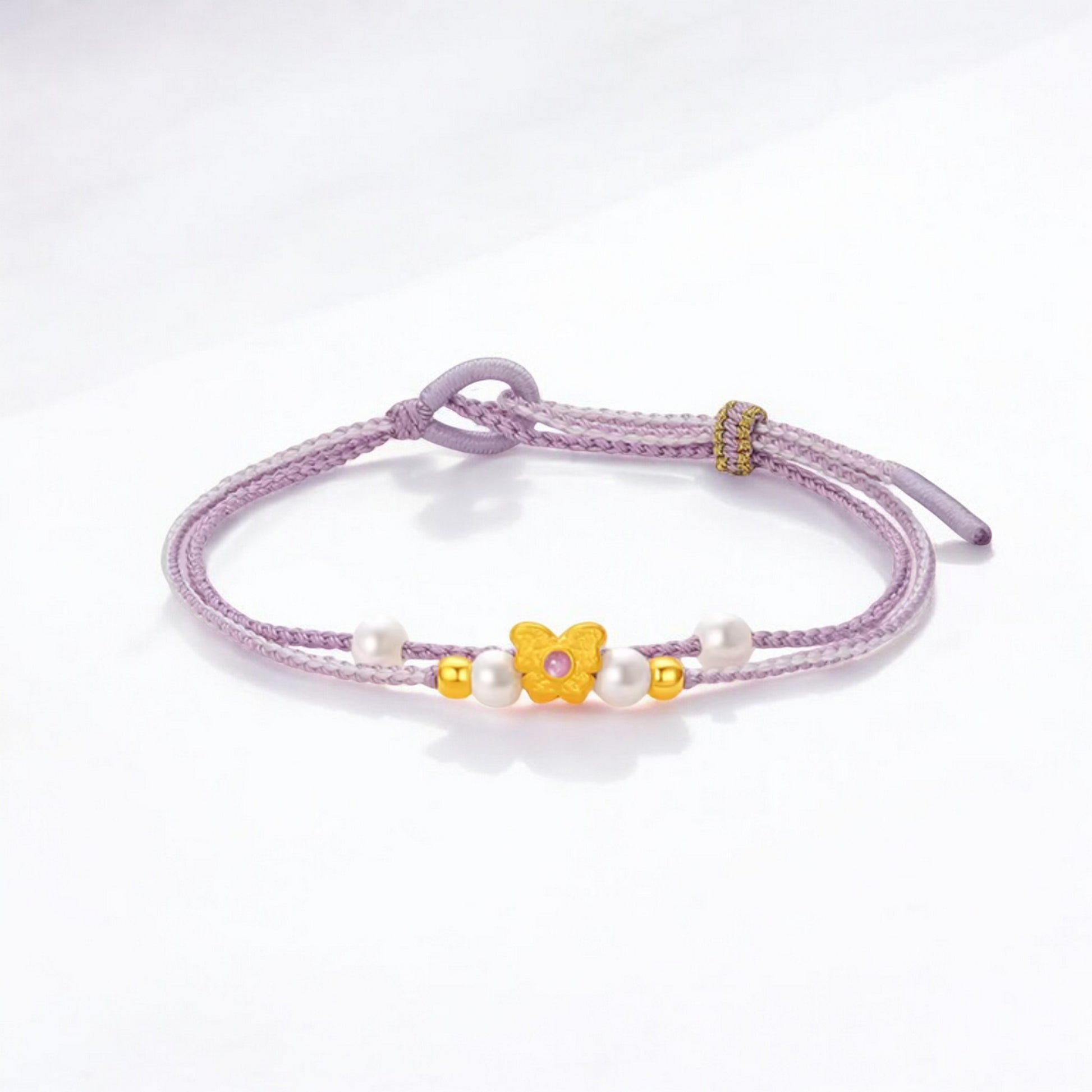 24K 5G 999 Hard Gold Star Butterfly Flower Style Charm Pearl Braided Bracelet