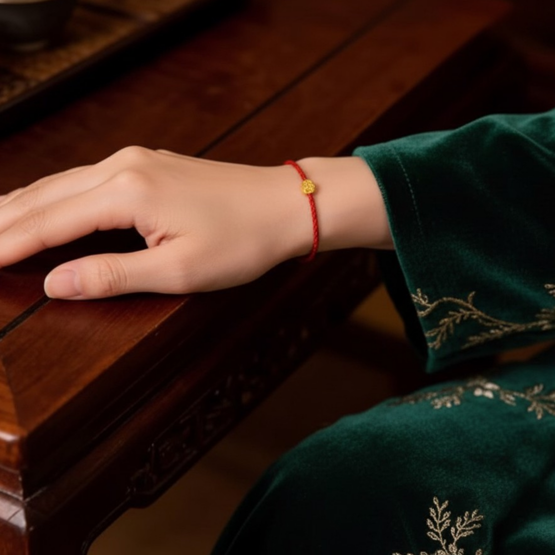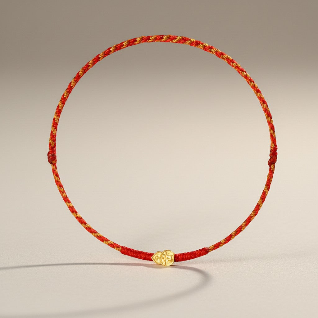 Embrace timeless fortune with this exquisite 24K gold lucky gourd charm bracelet. Handcrafted from pure 999 gold, this piece combines traditional symbolism with refined elegance. The gourd charm—a cherished emblem of prosperity and protection—is strung on a delicate red rope braided design, creating a meaningful accessory for your wrist or ankle. Each bracelet is individually made to order, ensuring quality craftsmanship in every detail. The vibrant red rope contrasts beautifully with the lustrous gold, making this a versatile piece for both everyday wear and special occasions.