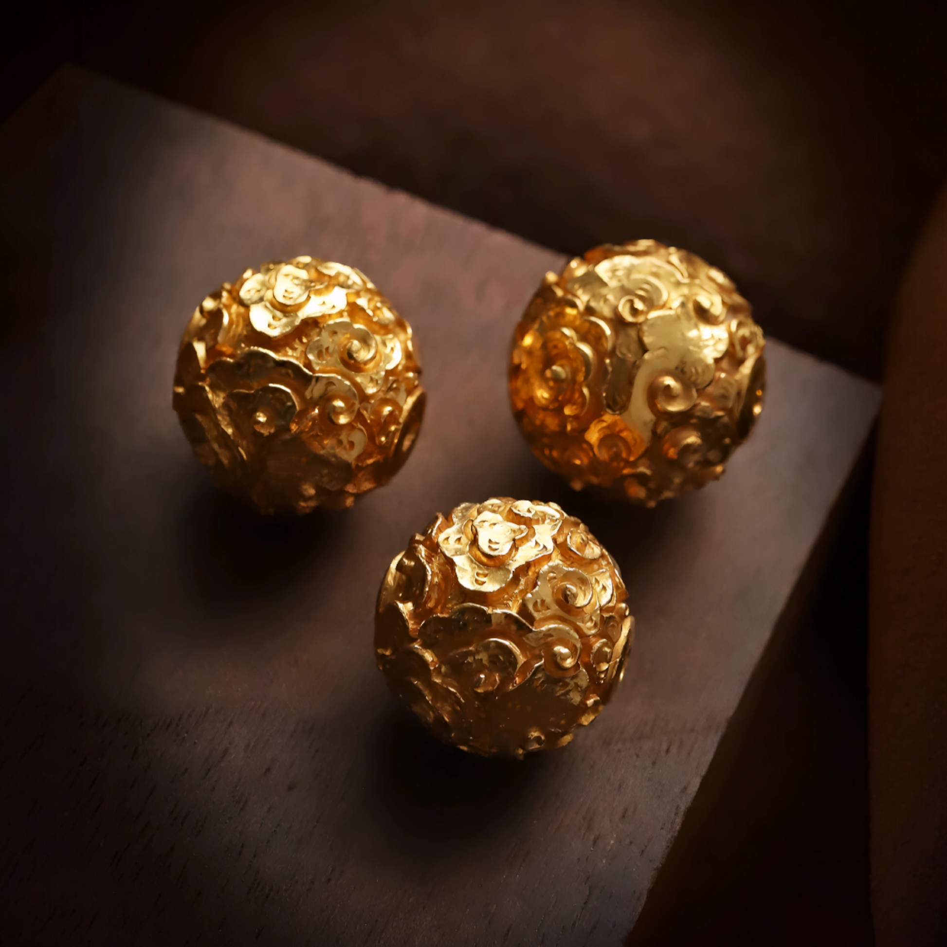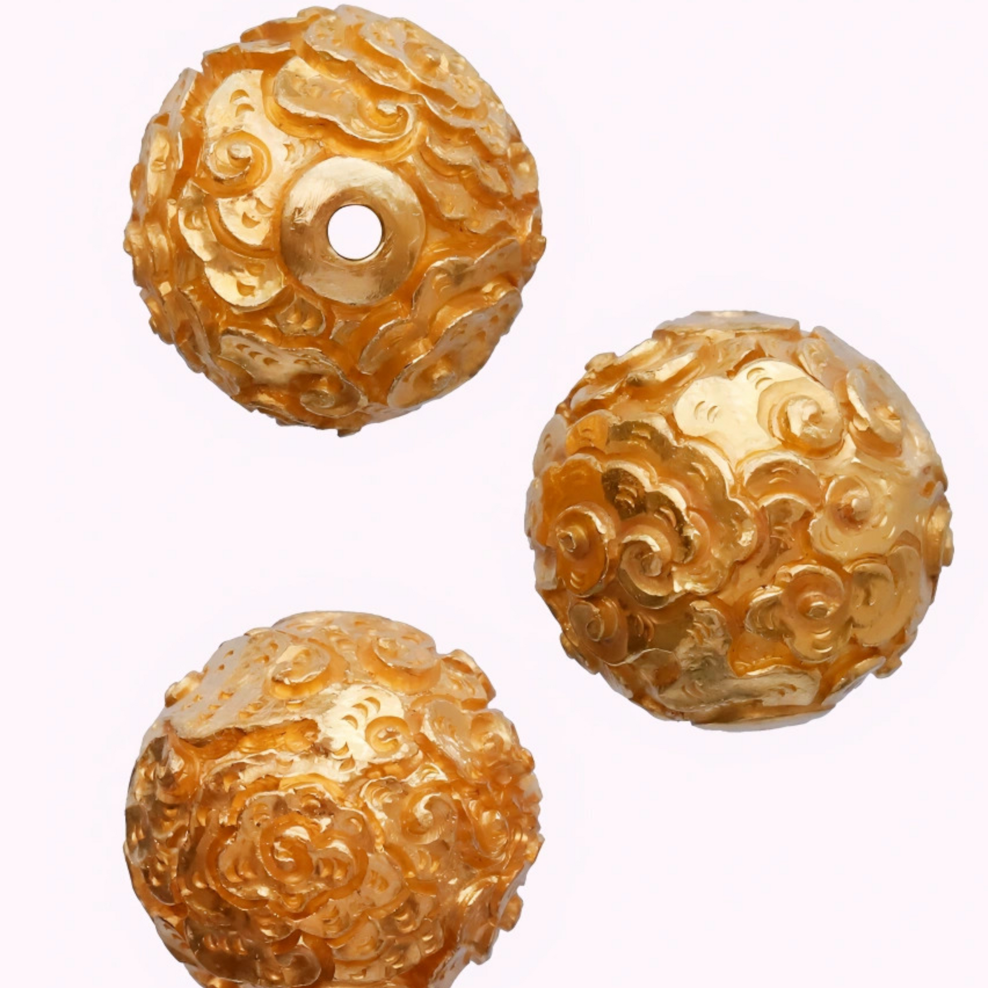 24K 999 Gold Ancient Vintage Engraved Lucky Cloud Pattern Round Bead Charm Spacer Pendant