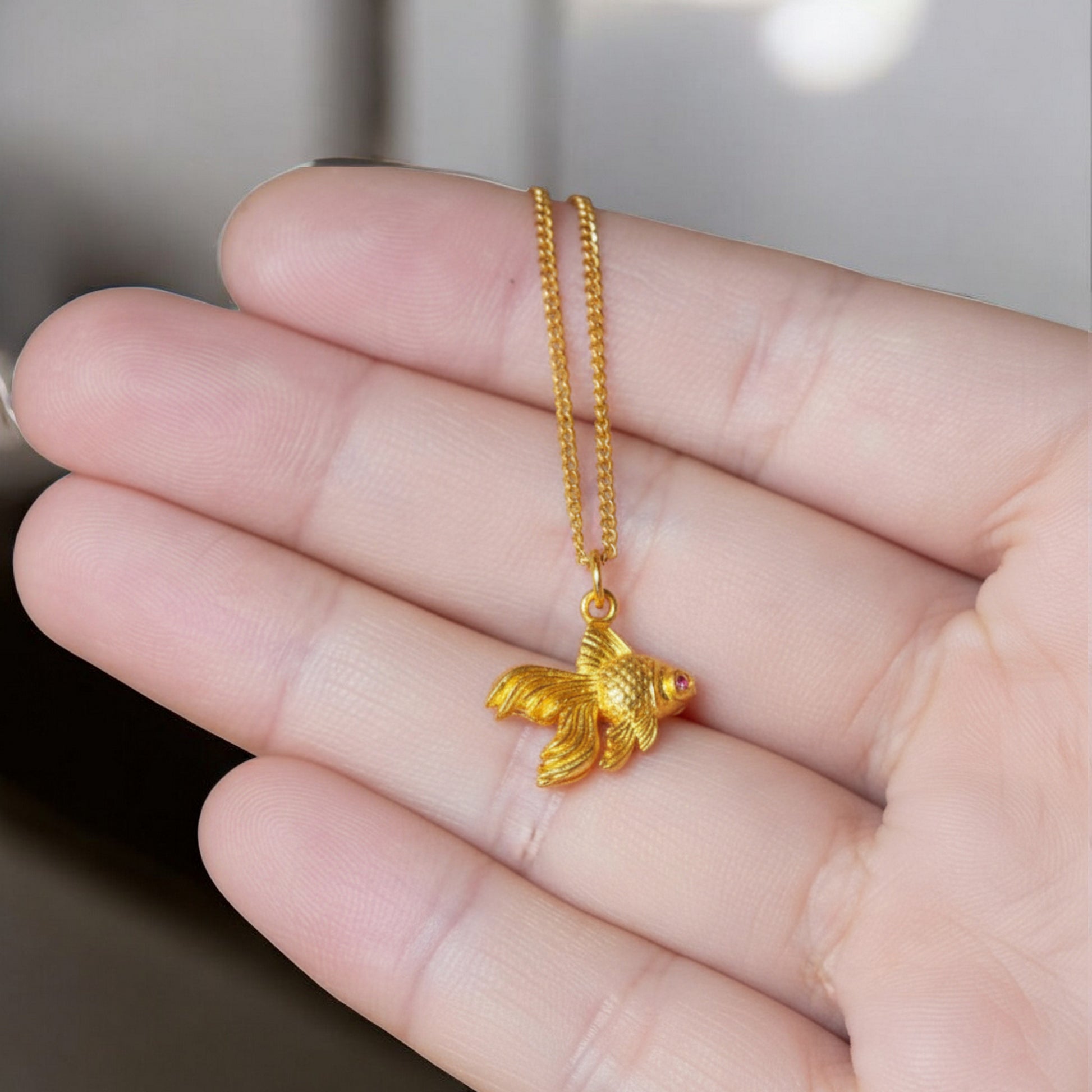 24K 999 Pure Gold Hand-Engraved Goldfish Fish Pendant