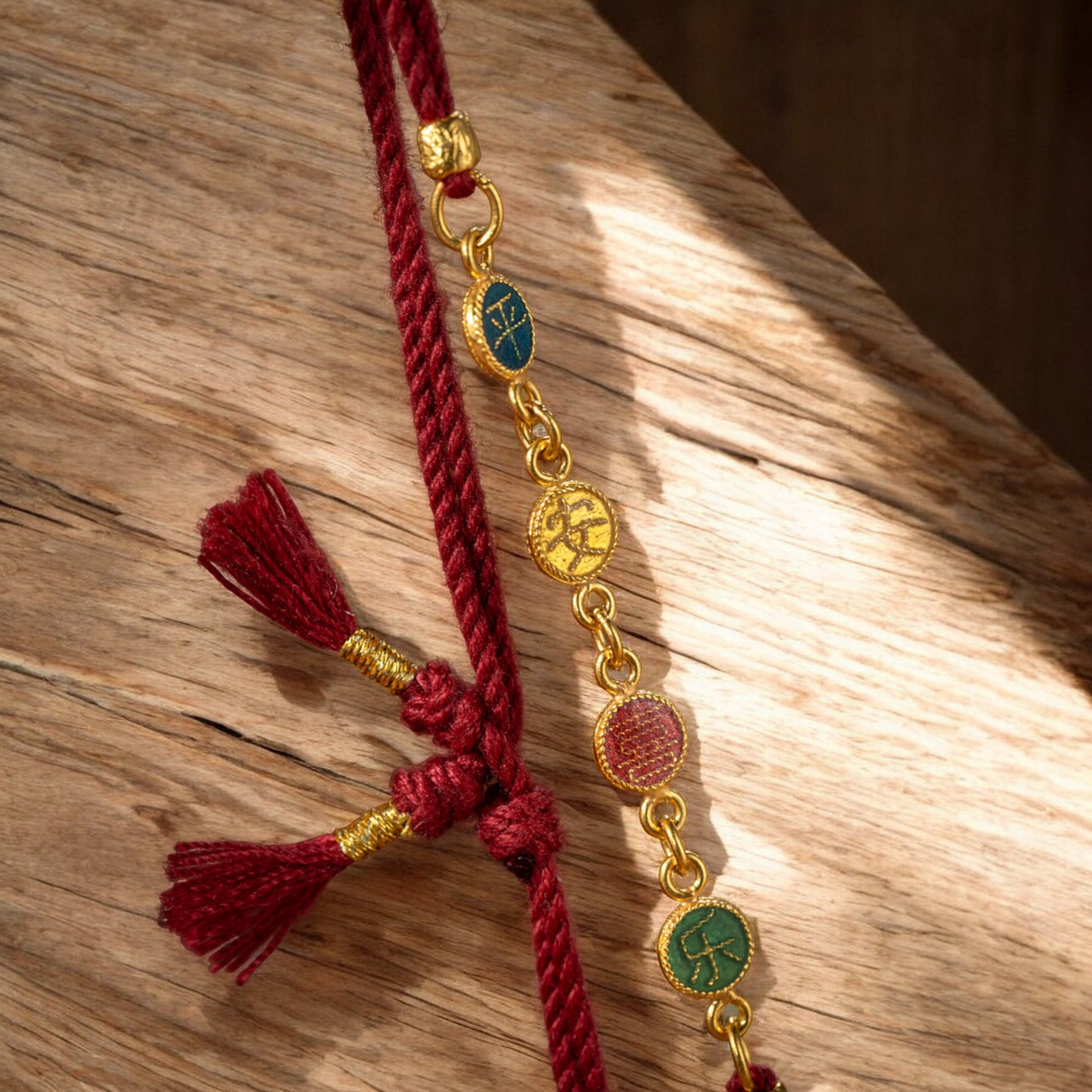 Crafted from 24k 999 gold with vibrant red enamel detailing, this charm bracelet features traditional Chinese characters symbolizing peace and joy. The delicate gold charm is suspended from a soft red rope string, creating an elegant piece that bridges cultural significance with contemporary design. Perfect for layering or wearing solo, this bracelet combines precious materials with meaningful symbolism, making it an ideal gift or personal keepsake.