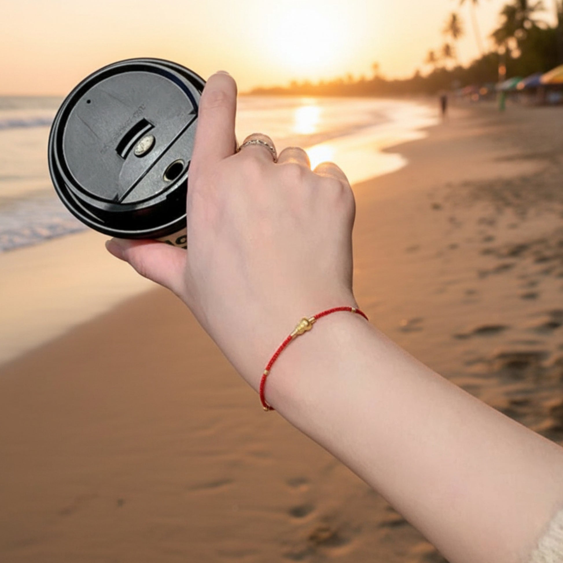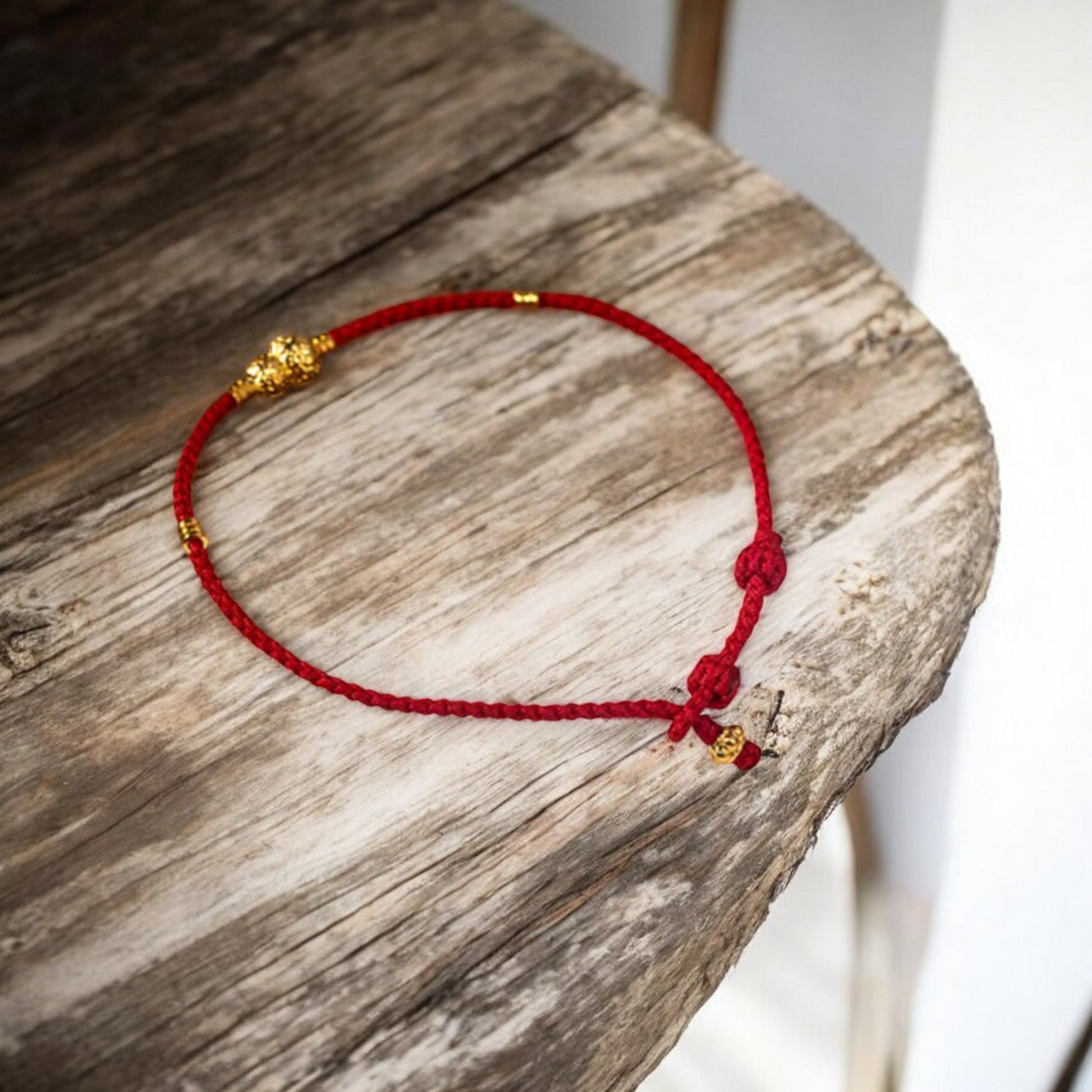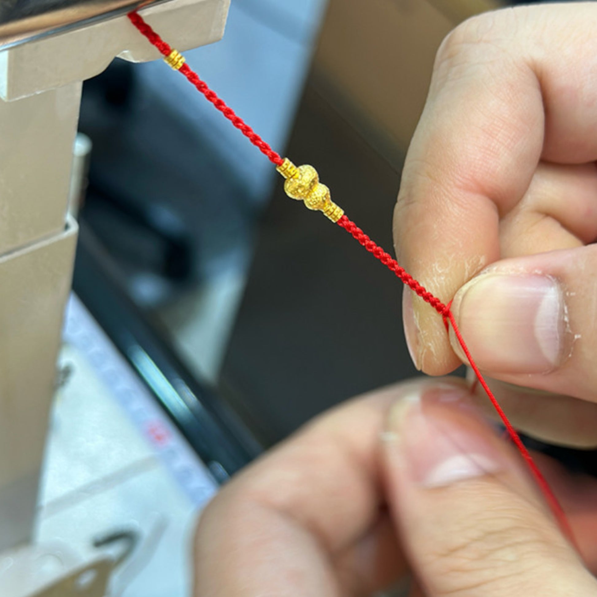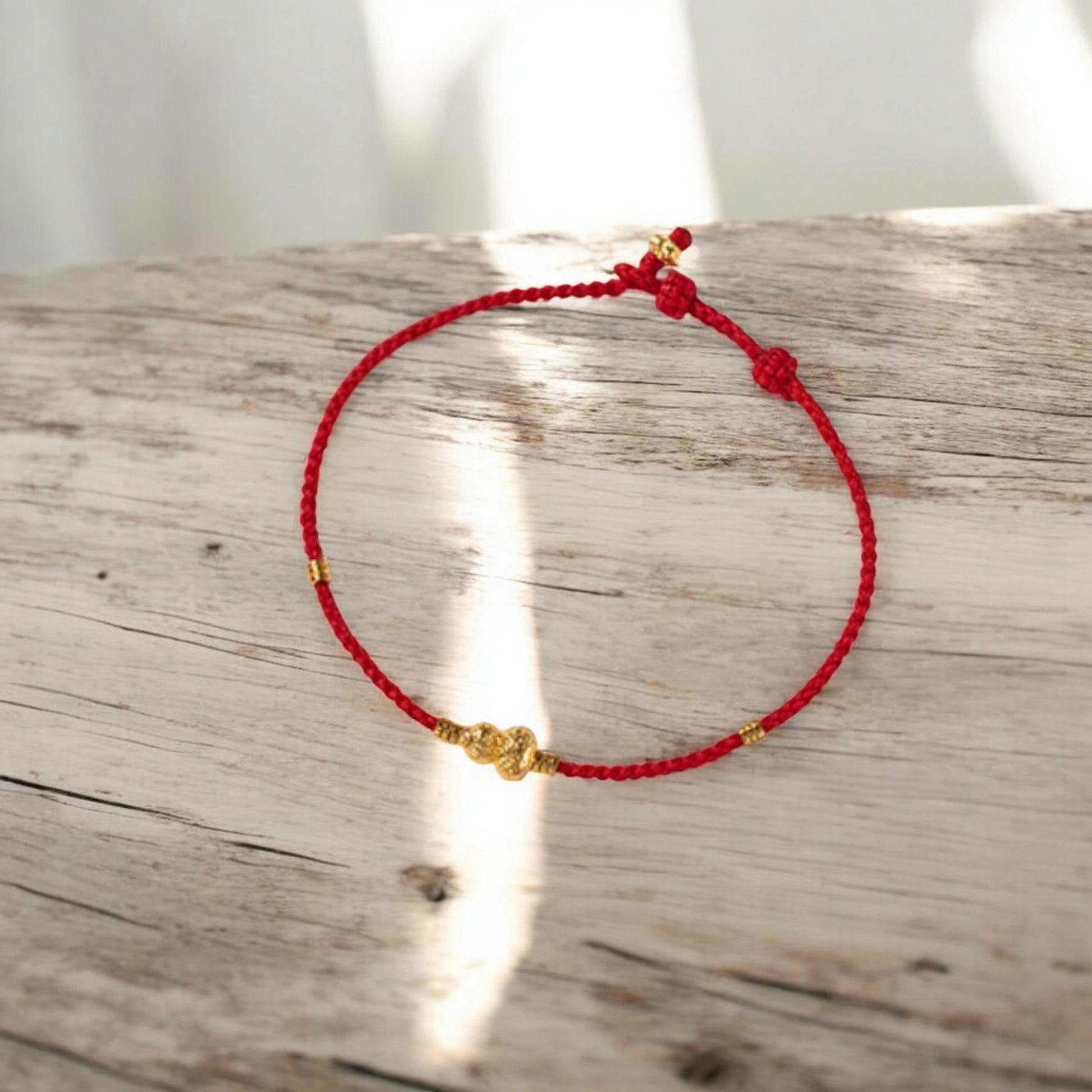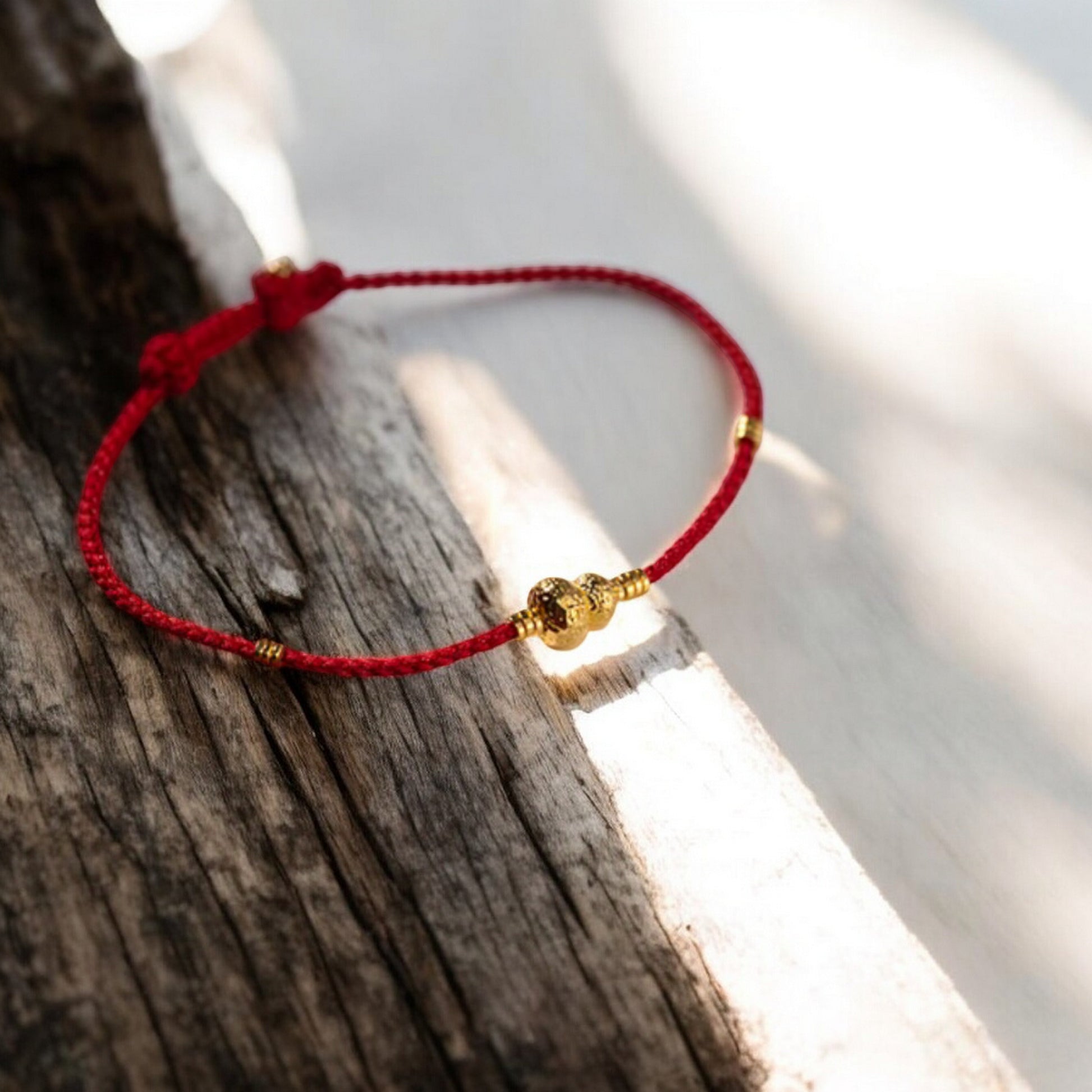 Crafted from authentic 24k 999 gold, this bracelet features a traditional lucky gourd charm symbolizing prosperity and abundance in Chinese culture. The delicate gold beads are strung on a vibrant red braided rope, combining timeless craftsmanship with meaningful symbolism. The adjustable design ensures a comfortable fit for any wrist. Perfect for those seeking to blend cultural heritage with elegant everyday wear or as a thoughtful gift celebrating good fortune and wellness.
