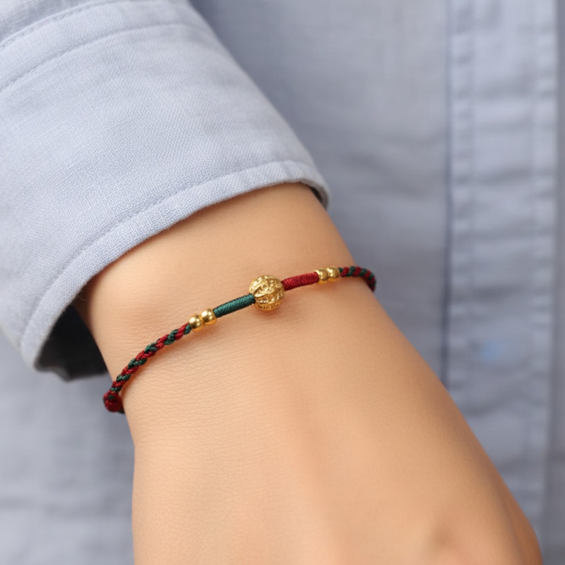 Crafted from pure 24k 999 gold, this walnut charm bracelet combines traditional artisanal techniques with timeless elegance. The woven red rope features intricate braiding that showcases skilled craftsmanship, while the delicate gold walnut charm adds a distinctive natural element. The supple rope design ensures comfortable wear and easy adjustment, making it an ideal accessory for both everyday styling and special occasions. A refined piece that bridges heritage craftsmanship with contemporary design sensibilities.