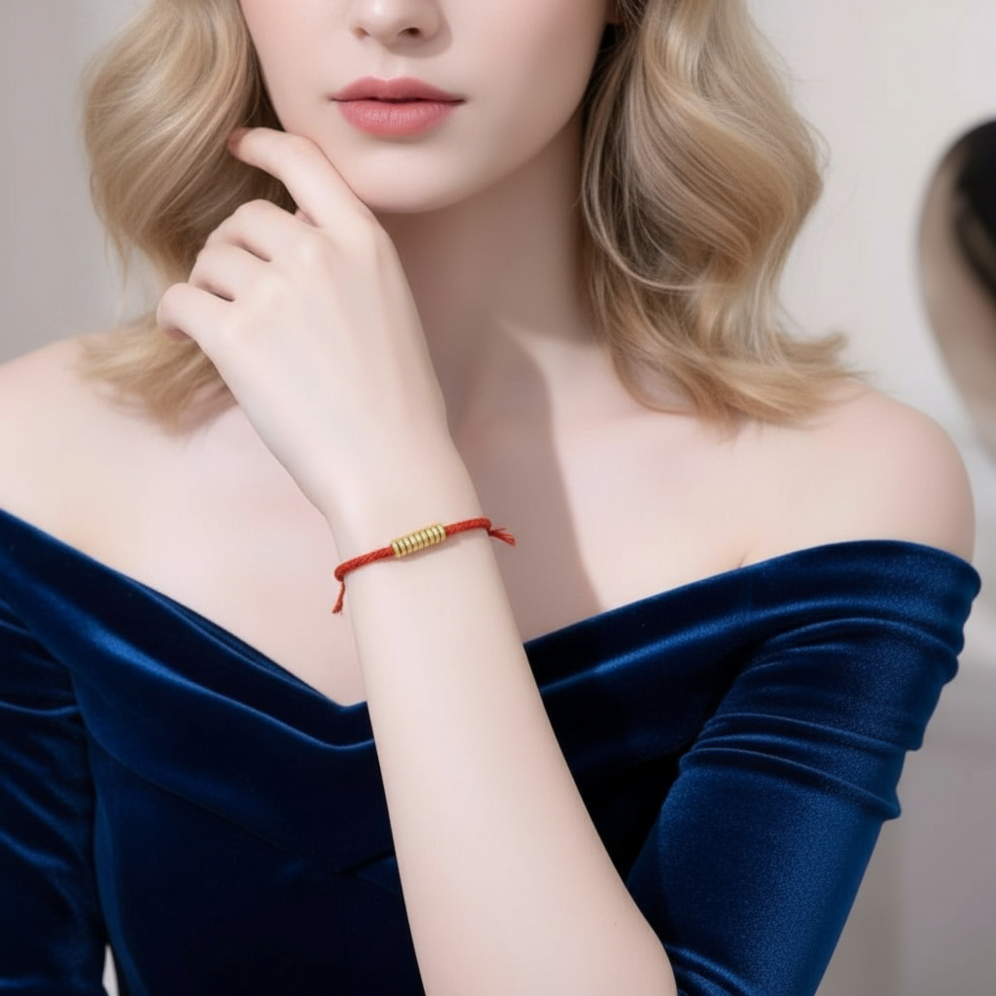 Crafted with authentic 24K 999 gold beads, this bracelet combines precious metal craftsmanship with traditional artisanal design. The vibrant red rope features intricate braiding that creates visual depth and texture, while the pure gold elements add timeless elegance and lasting value. The flexible string construction ensures comfortable everyday wear, making this piece both a refined accessory and a meaningful investment in quality jewelry.