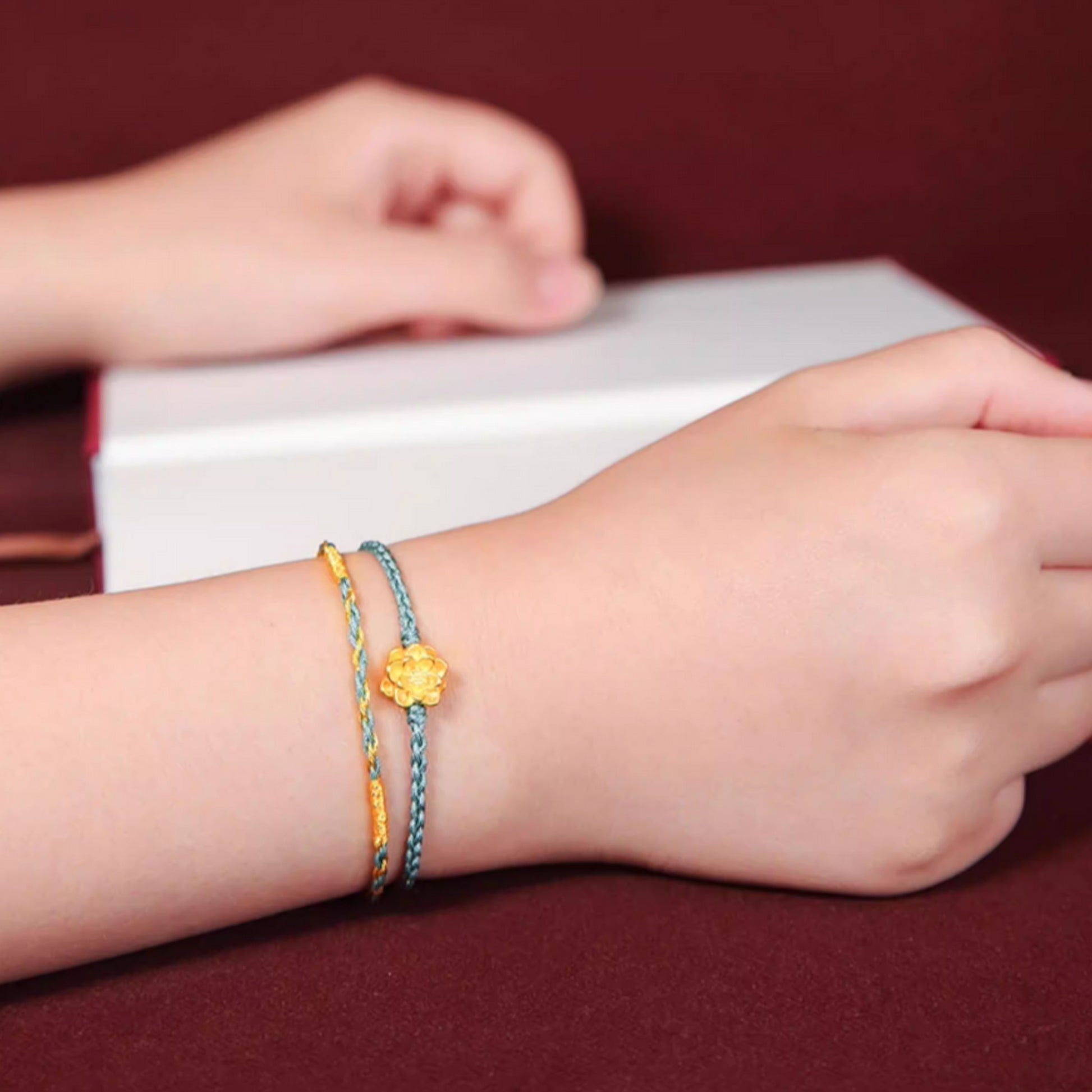 24K 999 Gold Lotus Flower Charm Double Rope Braided Bracelet