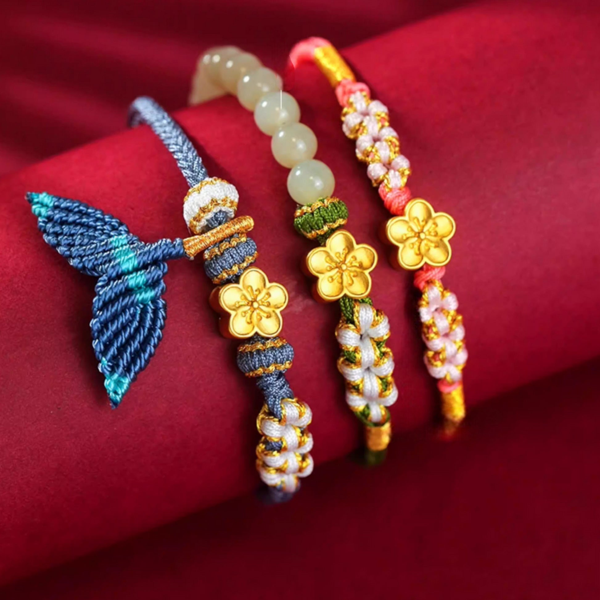 24K 999 Gold Peach Cherry Blossom Flower Charm Red Rope Braided Bracelet