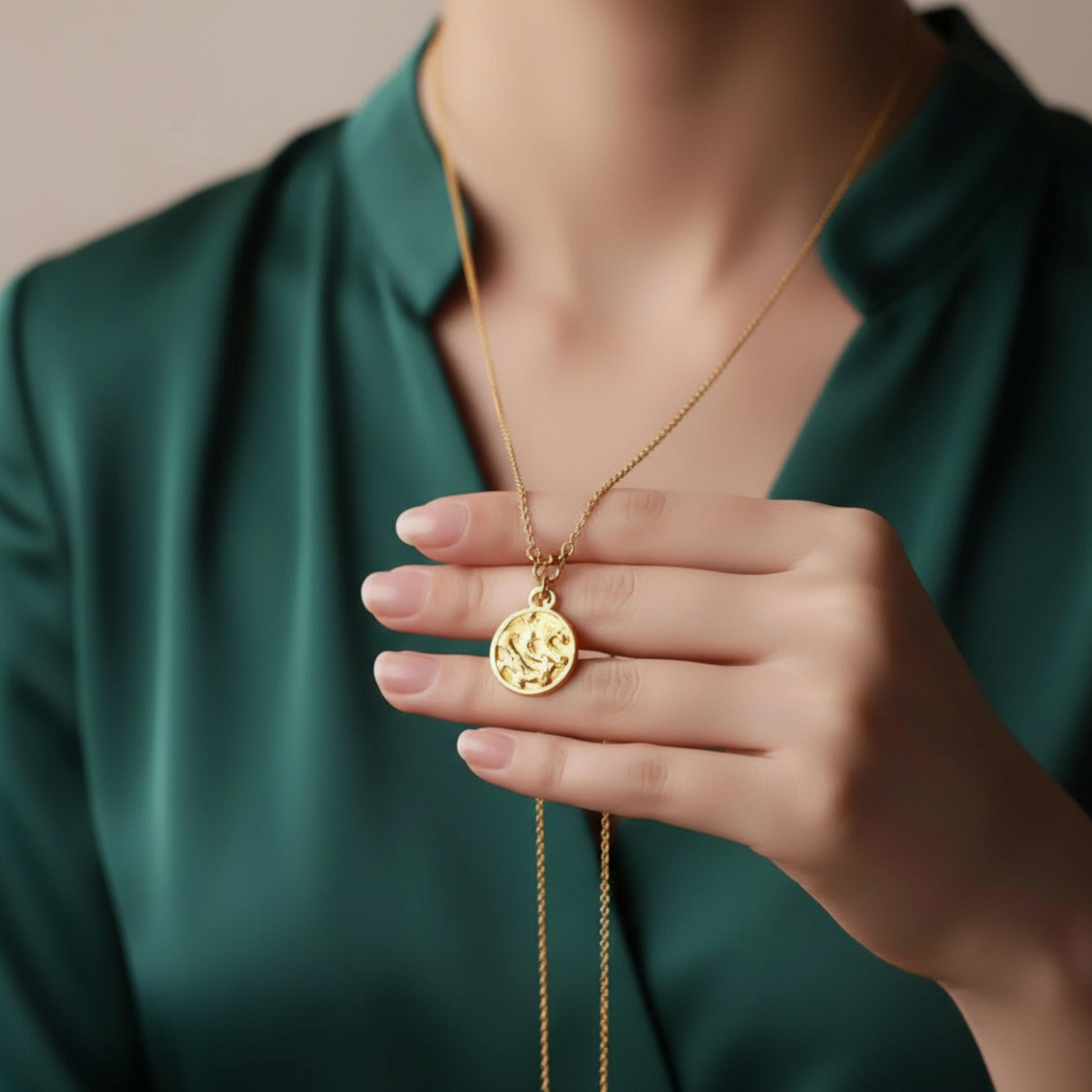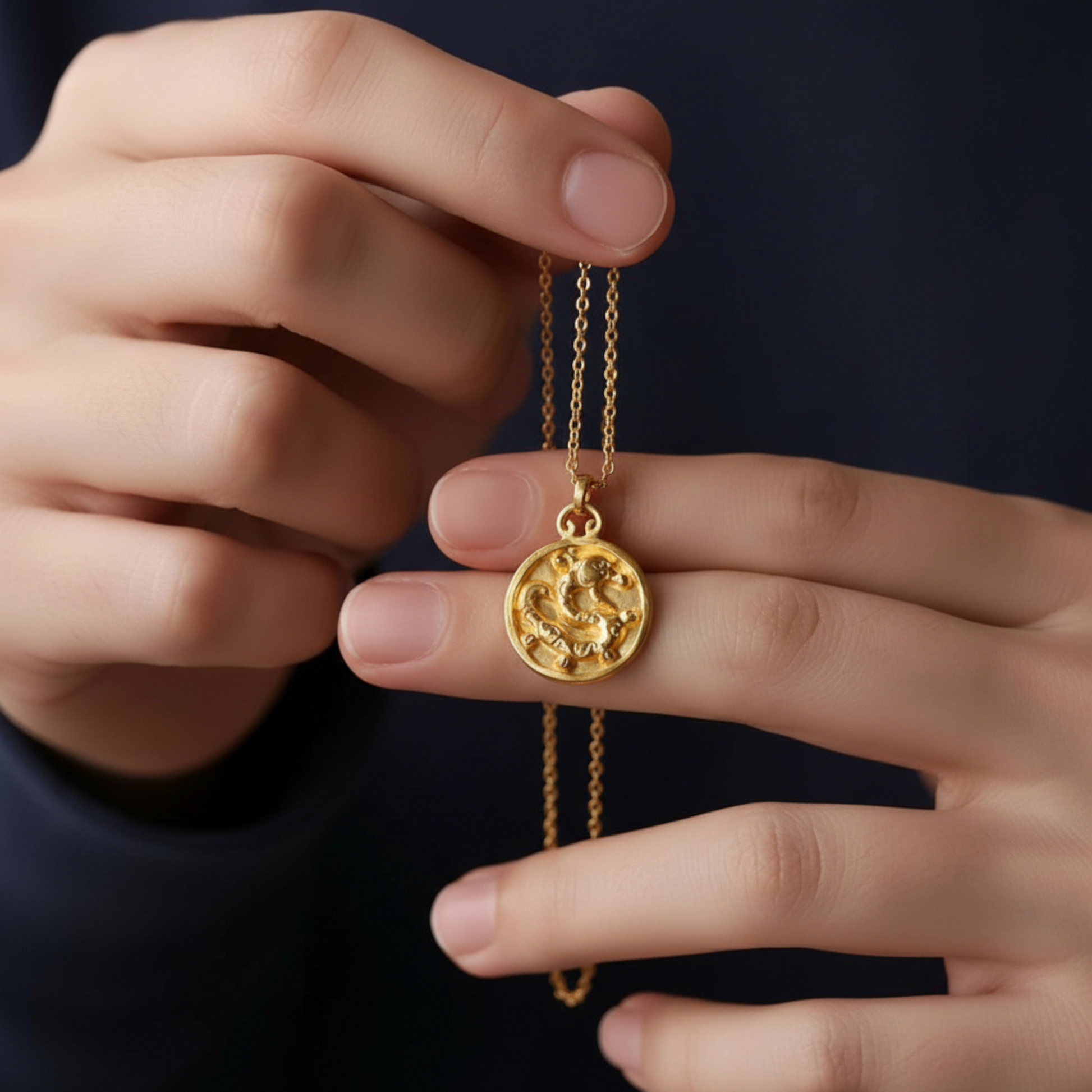 This exquisite 24K 999 gold pendant showcases masterful hand-carving artistry, featuring an intricately detailed dragon motif rendered in pure gold. The round charm design offers versatile styling options, whether worn as a standalone statement piece or incorporated into your custom jewelry creations. The dragon symbolism—traditionally associated with strength, prosperity, and protection—makes this pendant a meaningful addition to any collection. Perfect for DIY enthusiasts seeking premium materials, this hand-carved charm combines investment-grade gold purity with exceptional craftsmanship. An ideal choice for those who appreciate fine jewelry and the art of personalized adornment.
