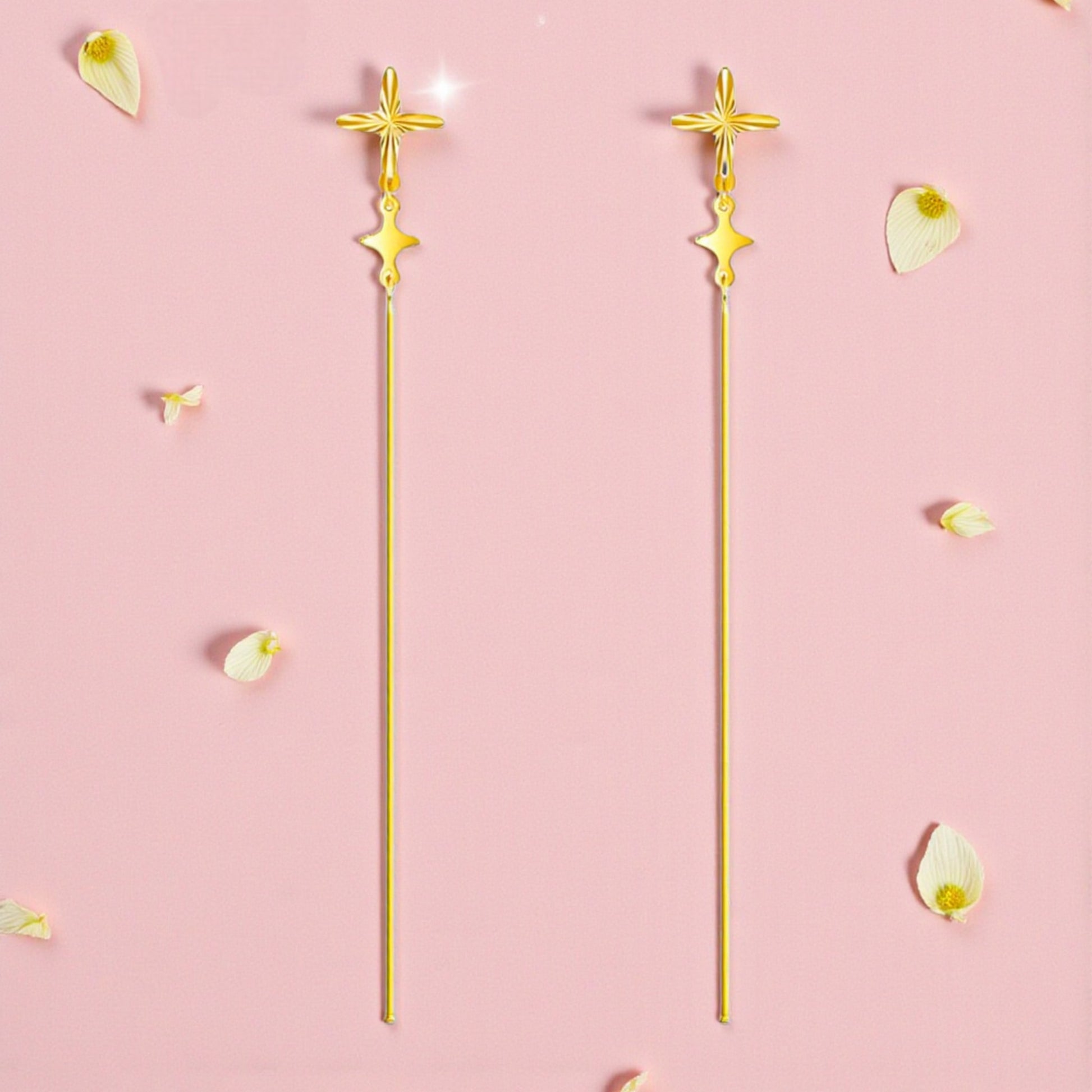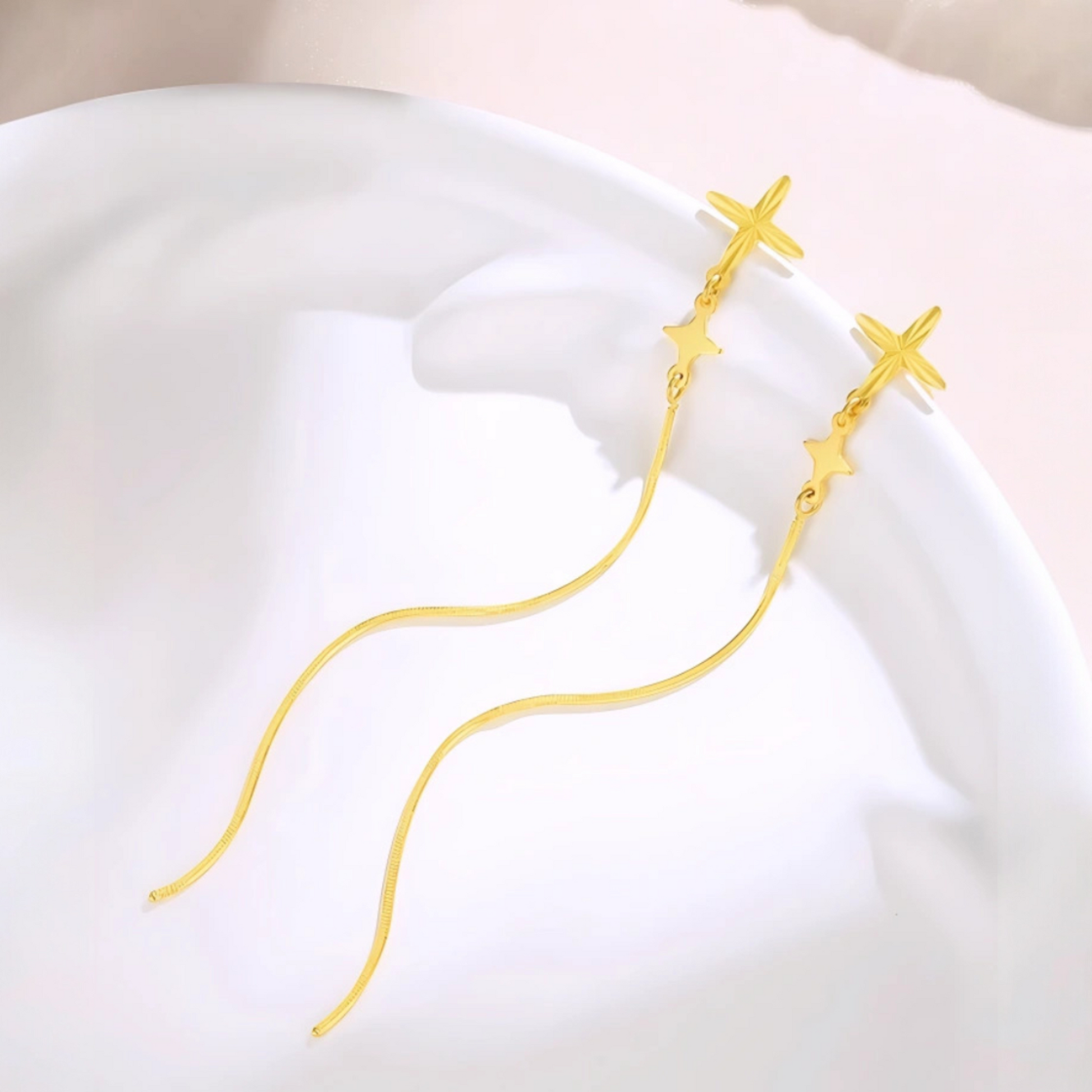 24K 999 Gold Trendy Threader Cross Charm Chain Tassel Earrings