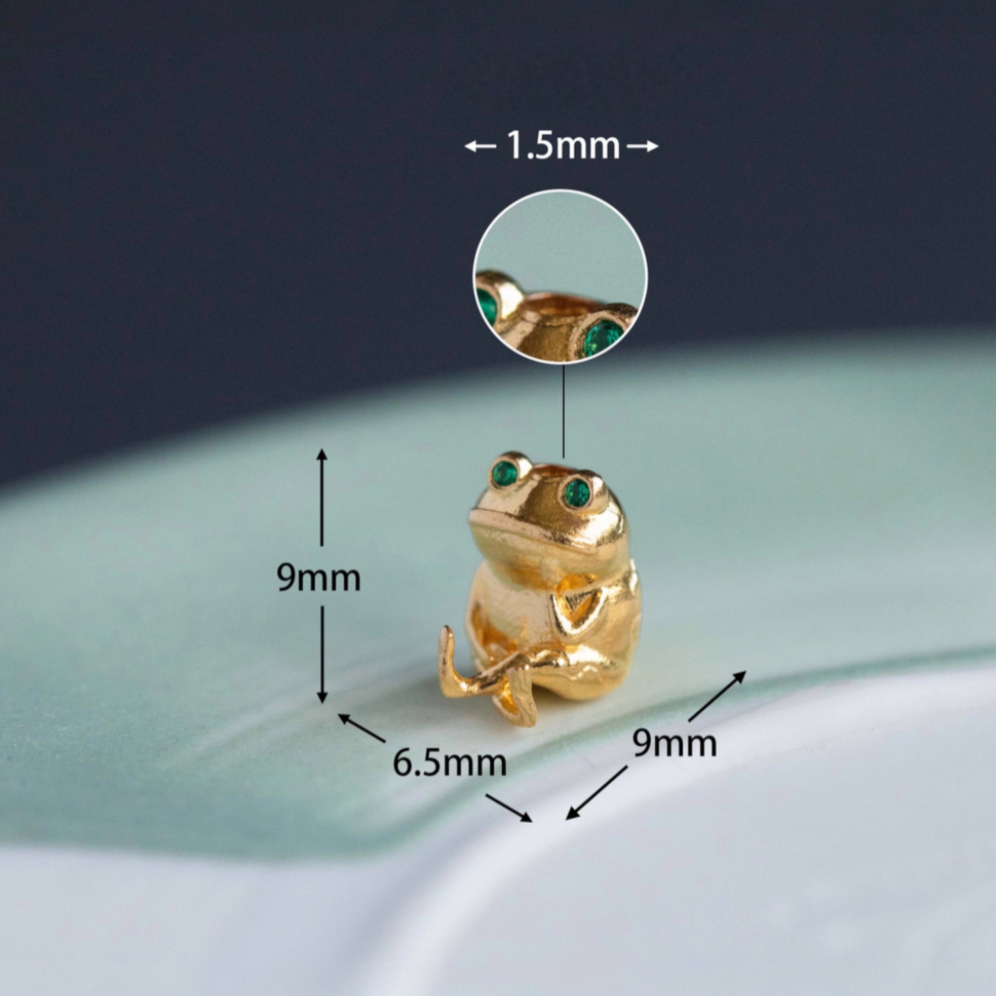 Elevate your jewelry creations with this exquisite 24K 999 pure gold frog charm, meticulously crafted for discerning artisans. Featuring a luminous green moissanite eye that captures light with exceptional brilliance, this diminutive charm combines precious materials with whimsical design. The strategically placed center hole accommodates standard jewelry wire and stringing materials, making it ideal for custom pendants, bracelets, or mixed-media pieces. Perfect for jewelers seeking to incorporate luxury elements into bespoke collections, this charm delivers both aesthetic appeal and functional versatility for your most ambitious D.I.Y projects.
