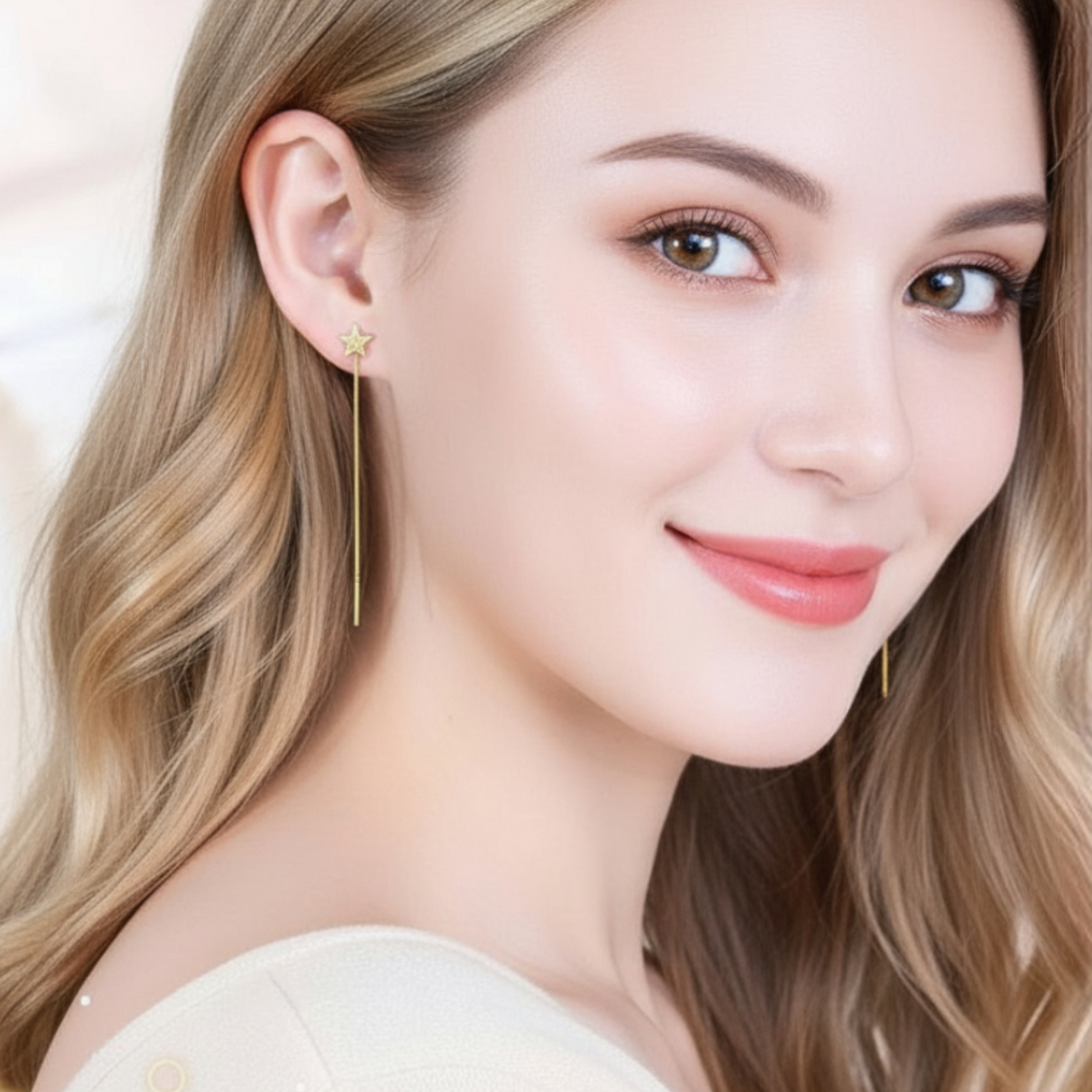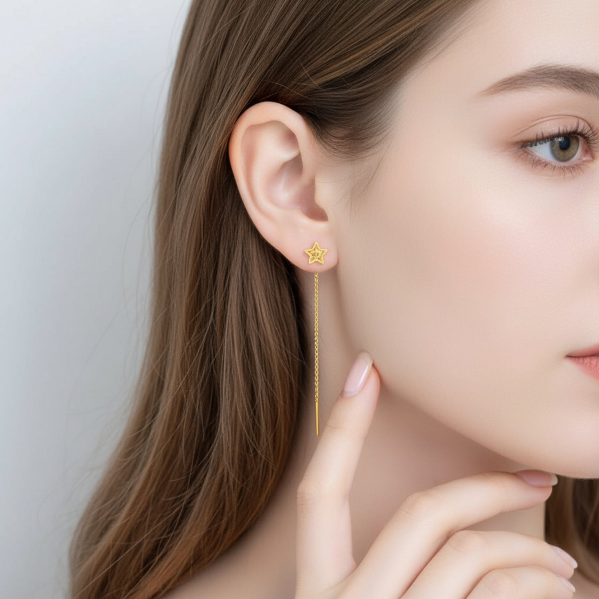 Elevate your jewelry collection with these sophisticated 24K gold threader chain earrings, featuring delicate star charm accents. Crafted from authentic pure gold, these pieces deliver timeless elegance with a contemporary edge. The threader design allows for effortless styling—simply thread through pierced ears for a secure, comfortable fit that moves gracefully with you. Perfect for layering or wearing solo, these earrings transition seamlessly from everyday wear to special occasions. An investment in quality craftsmanship that combines luxury materials with versatile design.
