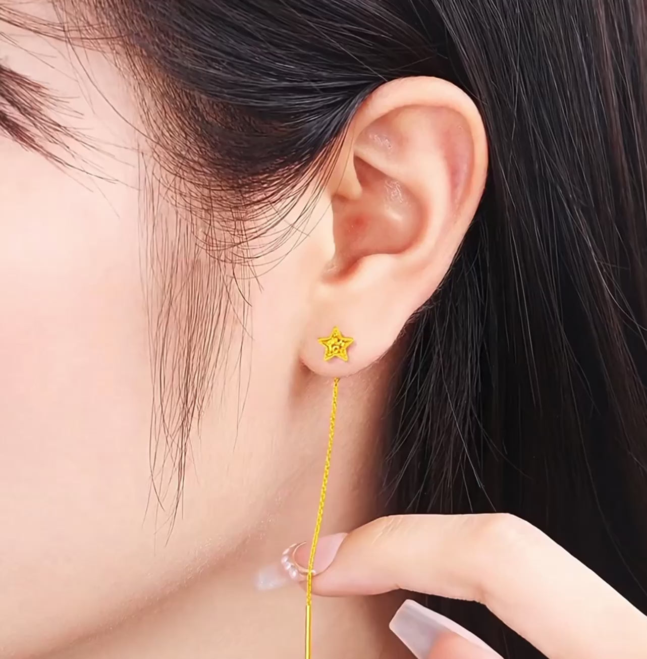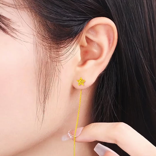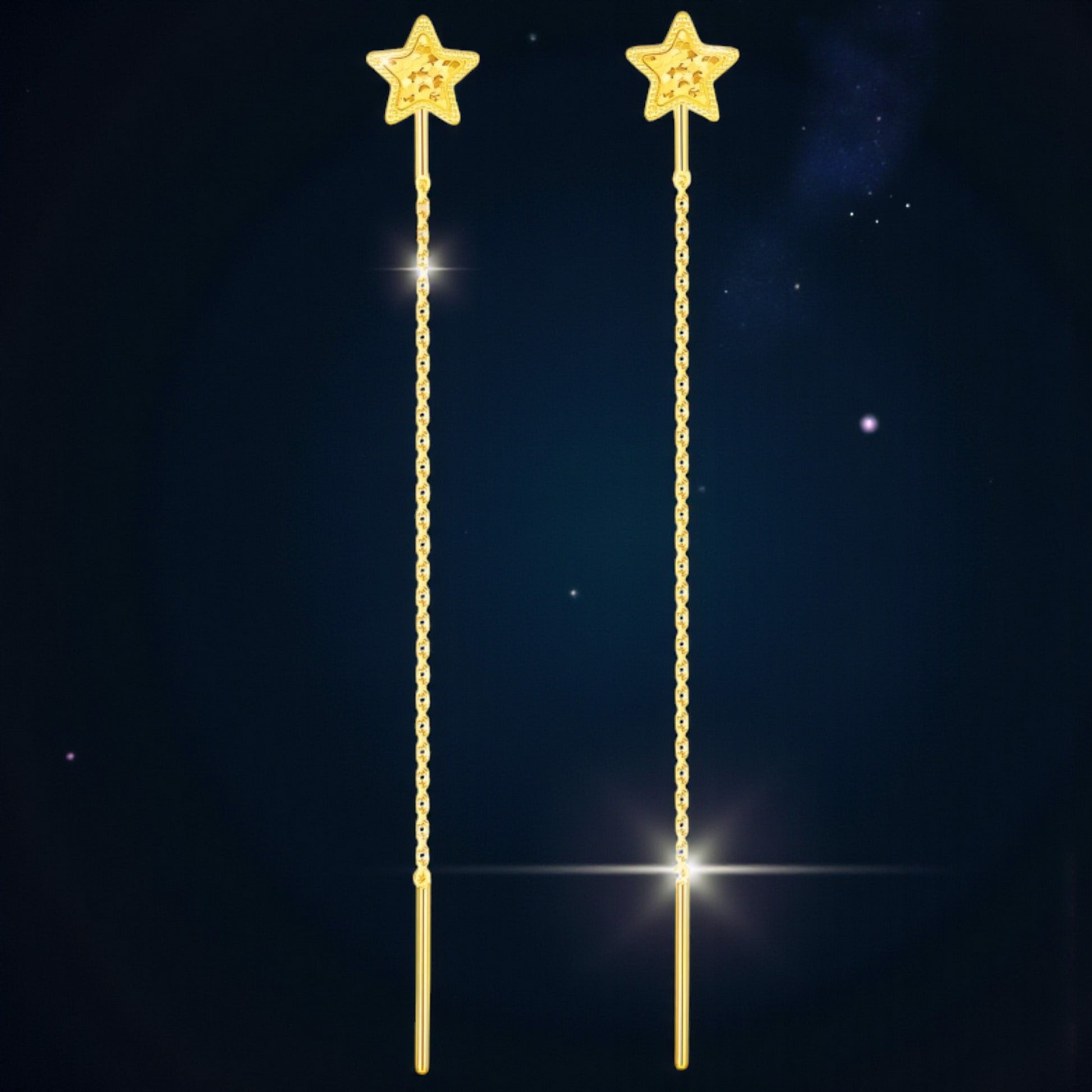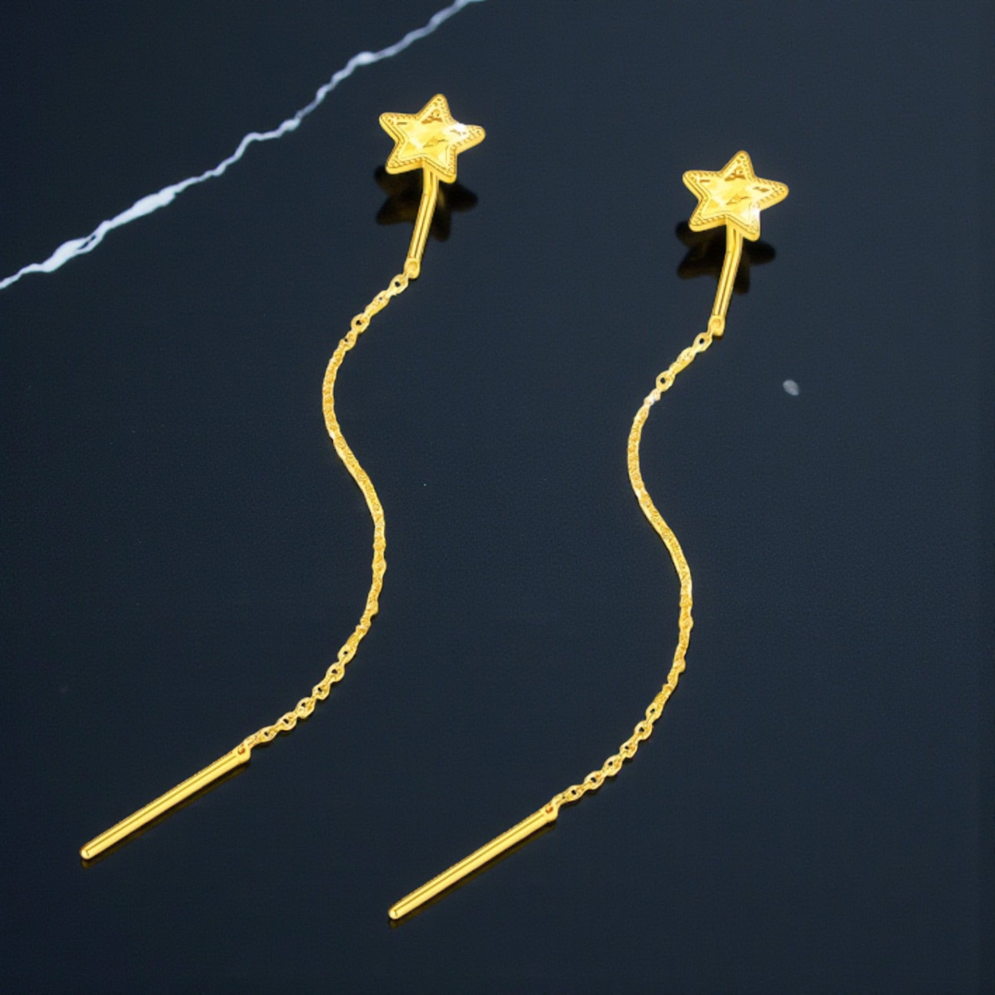 24K Authentic Pure Gold Trendy Threader Chain Star Charm Earrings