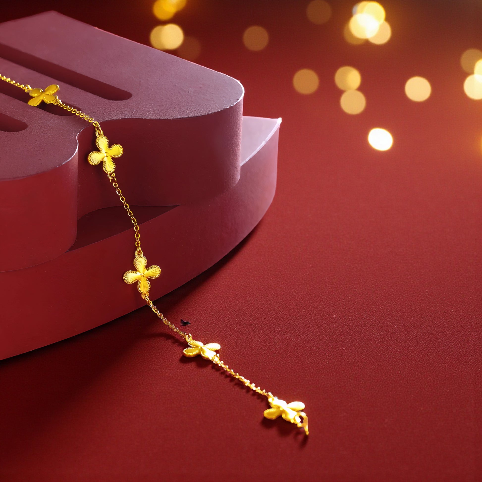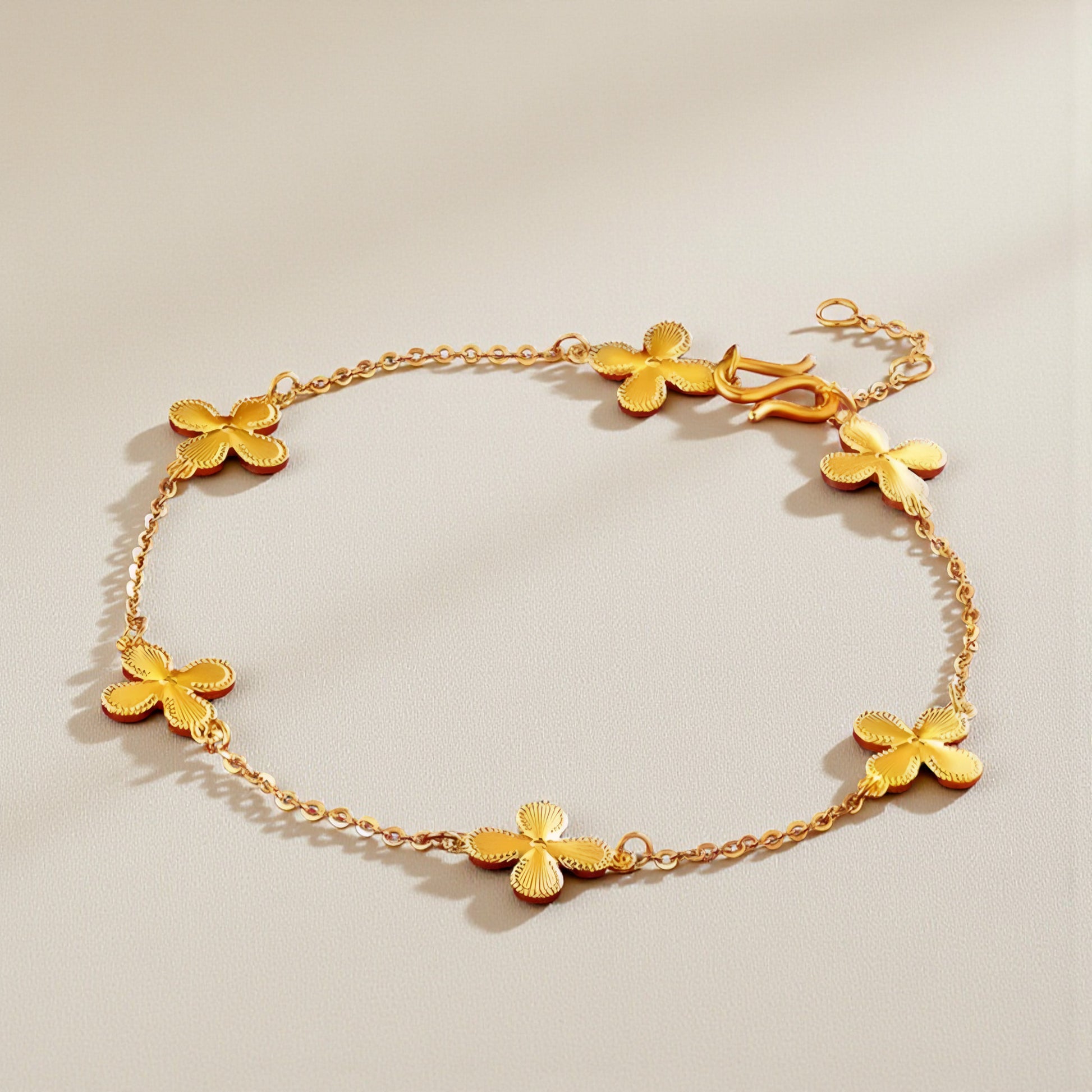 Crafted with precision, this 24K gold lucky clover charm bracelet combines timeless elegance with meaningful symbolism. The delicate clover pendant, a universal emblem of fortune and prosperity, is suspended from a refined gold chain designed for everyday wear. Each piece showcases authentic gold craftsmanship, ensuring durability and lasting luster. The adjustable fit accommodates various wrist sizes, making it an ideal gift or personal talisman. Whether worn for its aesthetic appeal or as a cherished symbol of good fortune, this bracelet seamlessly transitions from casual to formal occasions.