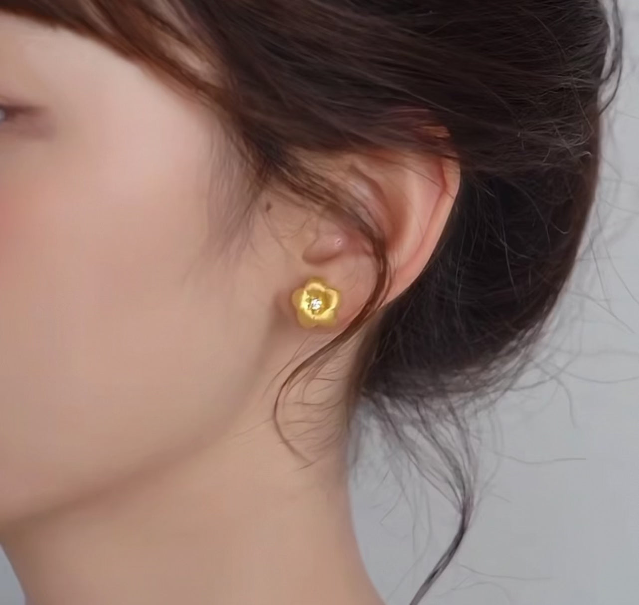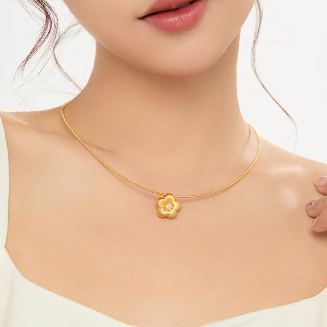 24K Golden Moissanite Flower Gold Stud Earrings And Flower Pendant 5D Retro Brushed Pattern