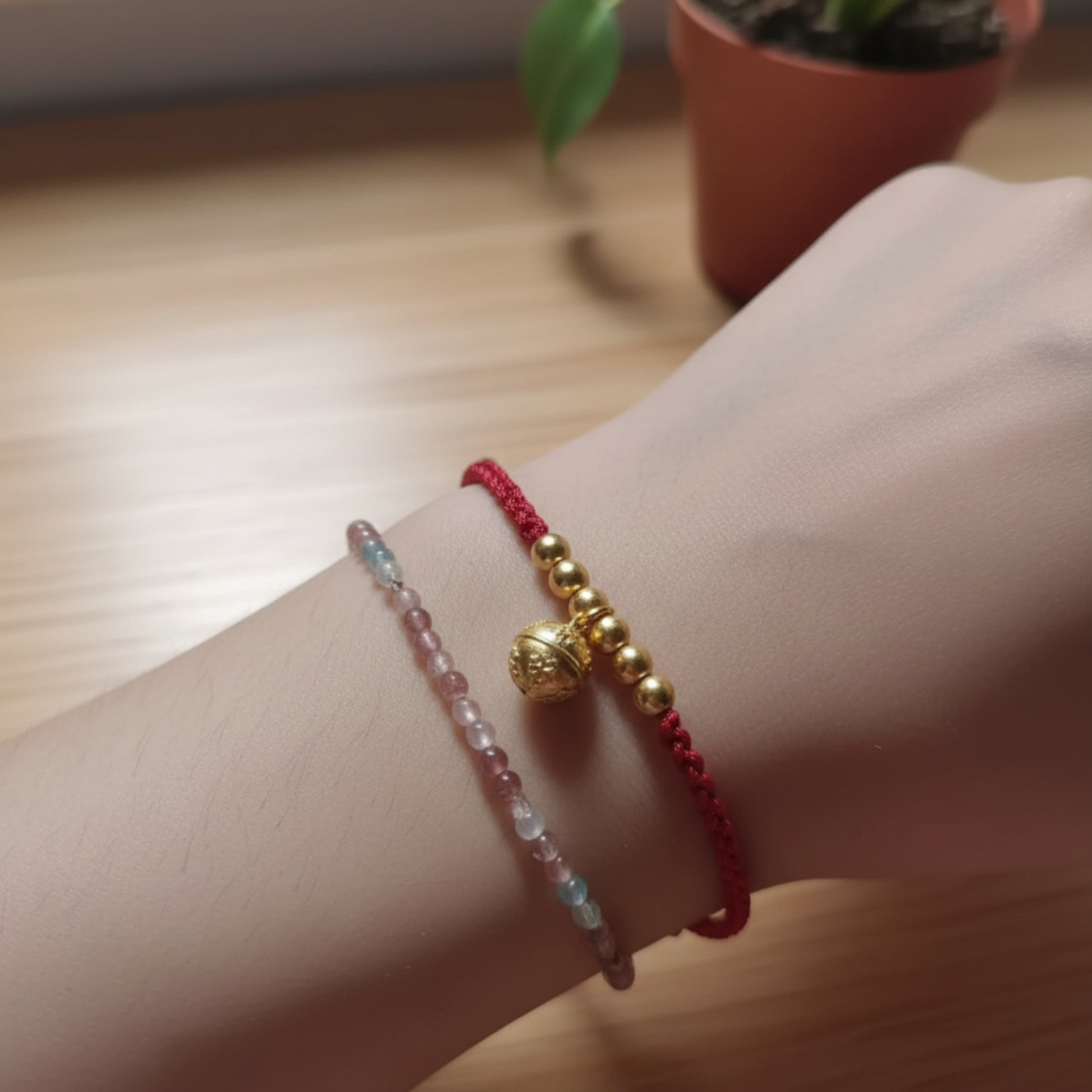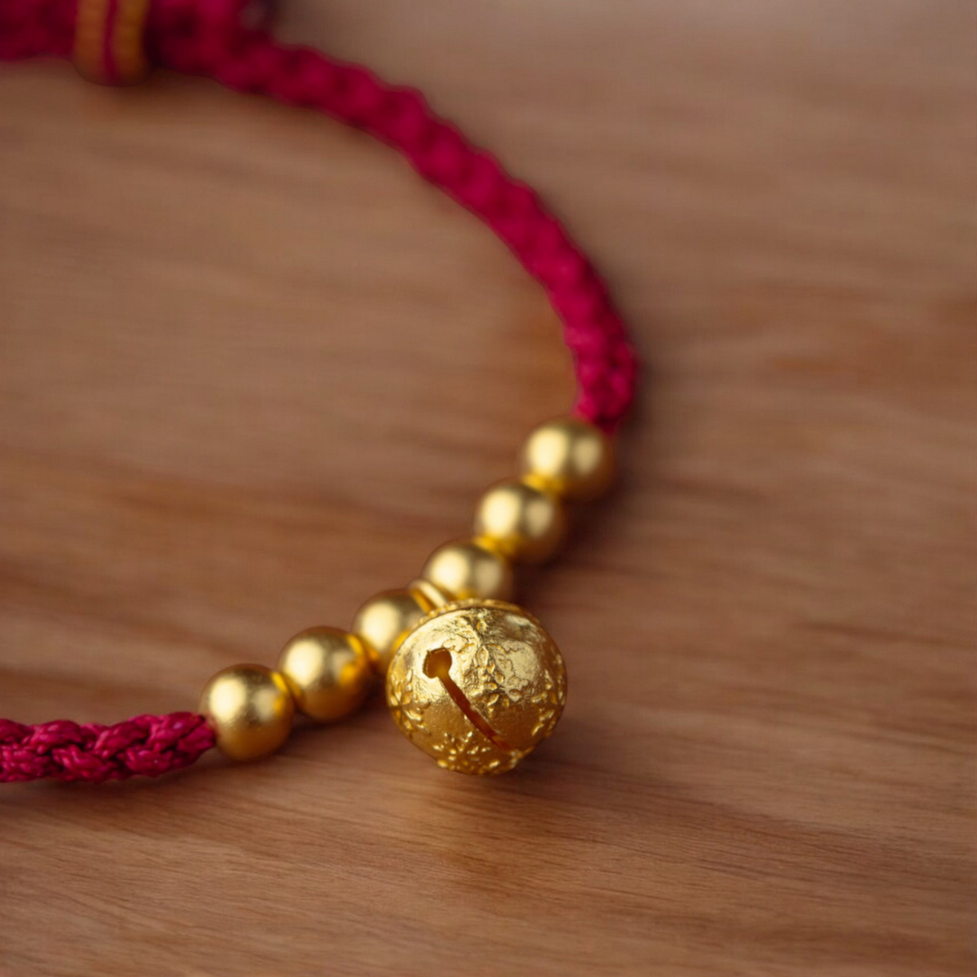 24K Pure 999 Gold Baby Beads and Bell Charm Handmade Rope Bracelet Babyshower Gift
