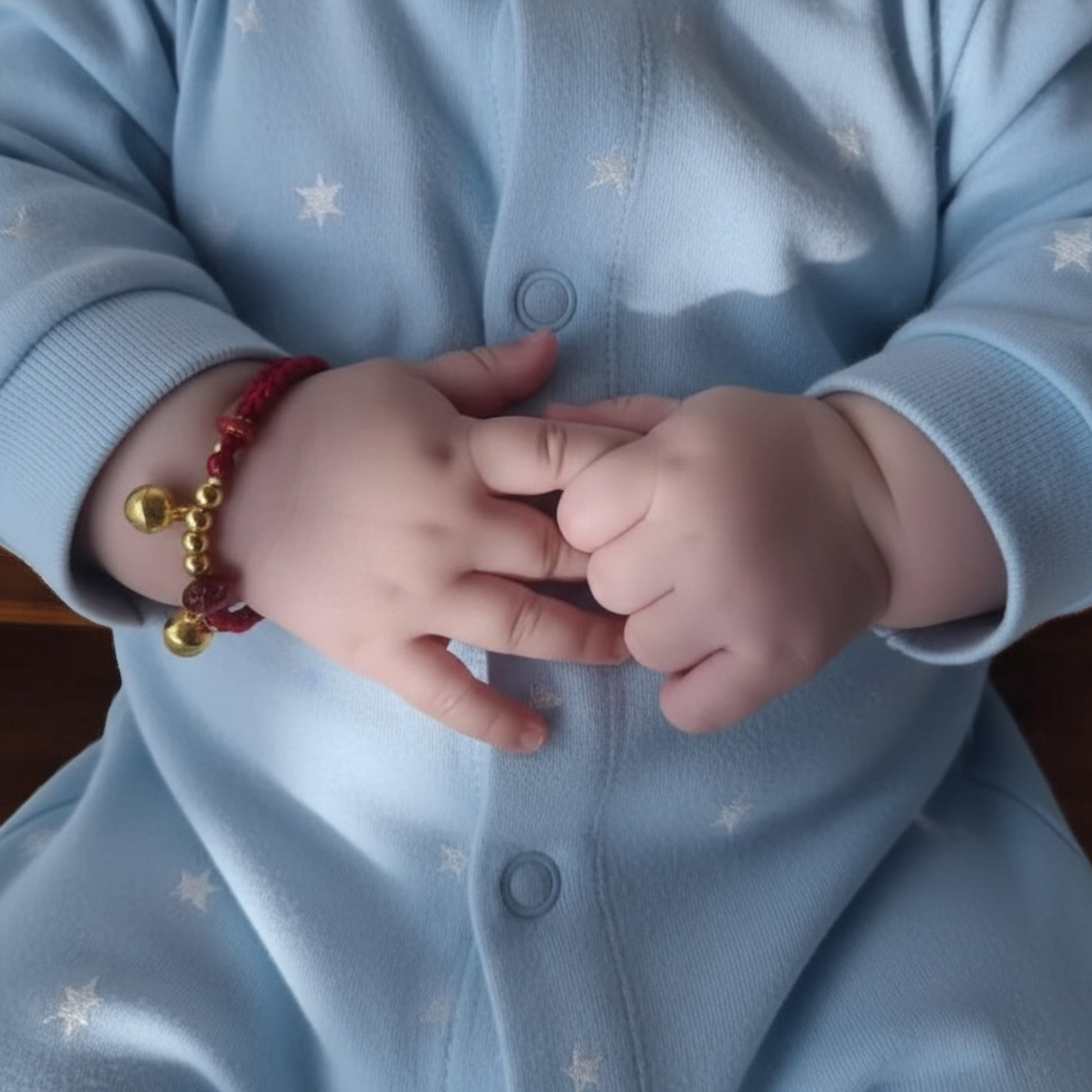 Celebrate new arrivals with this exquisite handmade bracelet crafted from 24K pure 999 gold. Delicate baby beads and a charming bell accent create a meaningful gift that captures the joy of babyshowers and milestone moments. Each piece is meticulously constructed by hand, ensuring quality and authenticity. The timeless design makes it an ideal gift for parents, godparents, or as a treasured heirloom to pass down through generations. A sophisticated way to commemorate life's precious beginnings.