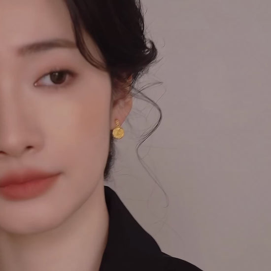 These 24K pure gold stud earrings feature an intricate design of a deer chasing the sun, symbolizing grace and vitality. Crafted with precision, they offer lasting shine and durability, making them a timeless addition to any jewelry collection. Perfect for those seeking a unique, elegant accessory that combines artistry with fine craftsmanship.