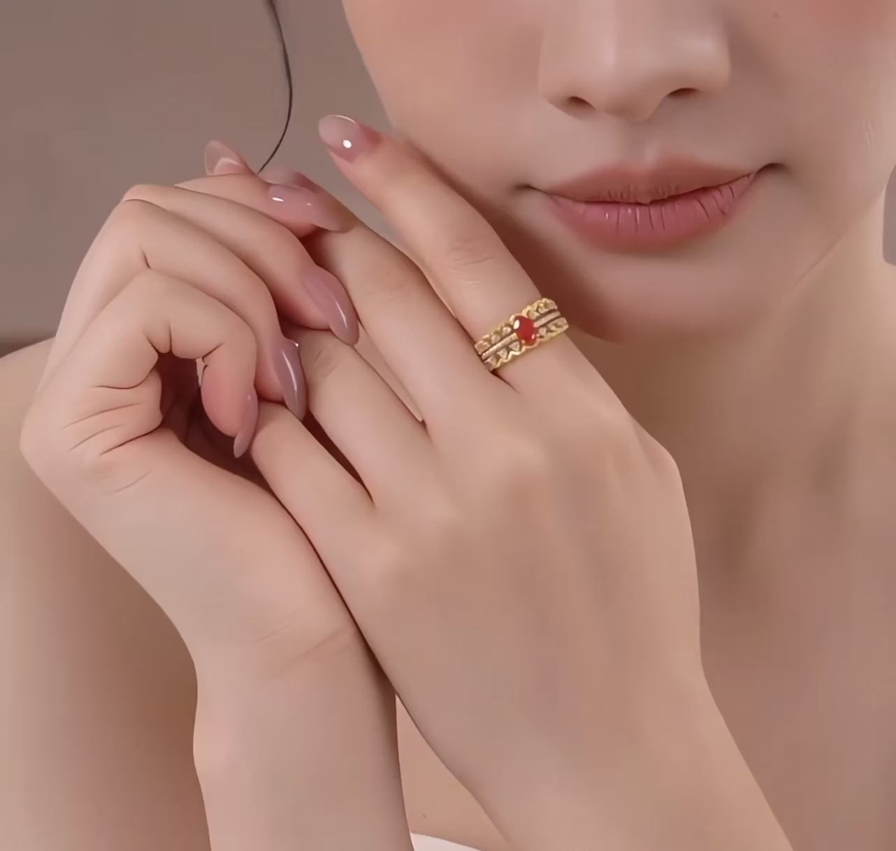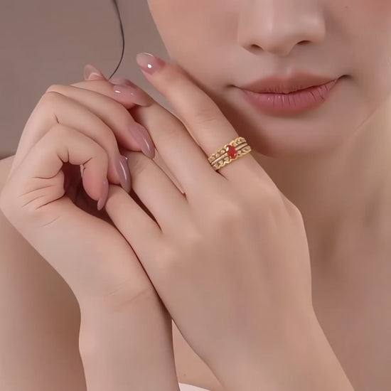 Crafted from 24K pure gold, this set features two detachable rings designed for versatile mixing and matching. Each ring is adorned with vibrant red zircon stones, adding a striking touch to your stacking collection. Perfect for proposals, weddings, or as a sophisticated bridal accessory, these rings allow for personalized style and meaningful customization. Durable and elegant, they combine traditional craftsmanship with contemporary design for an expert choice in fine jewelry.