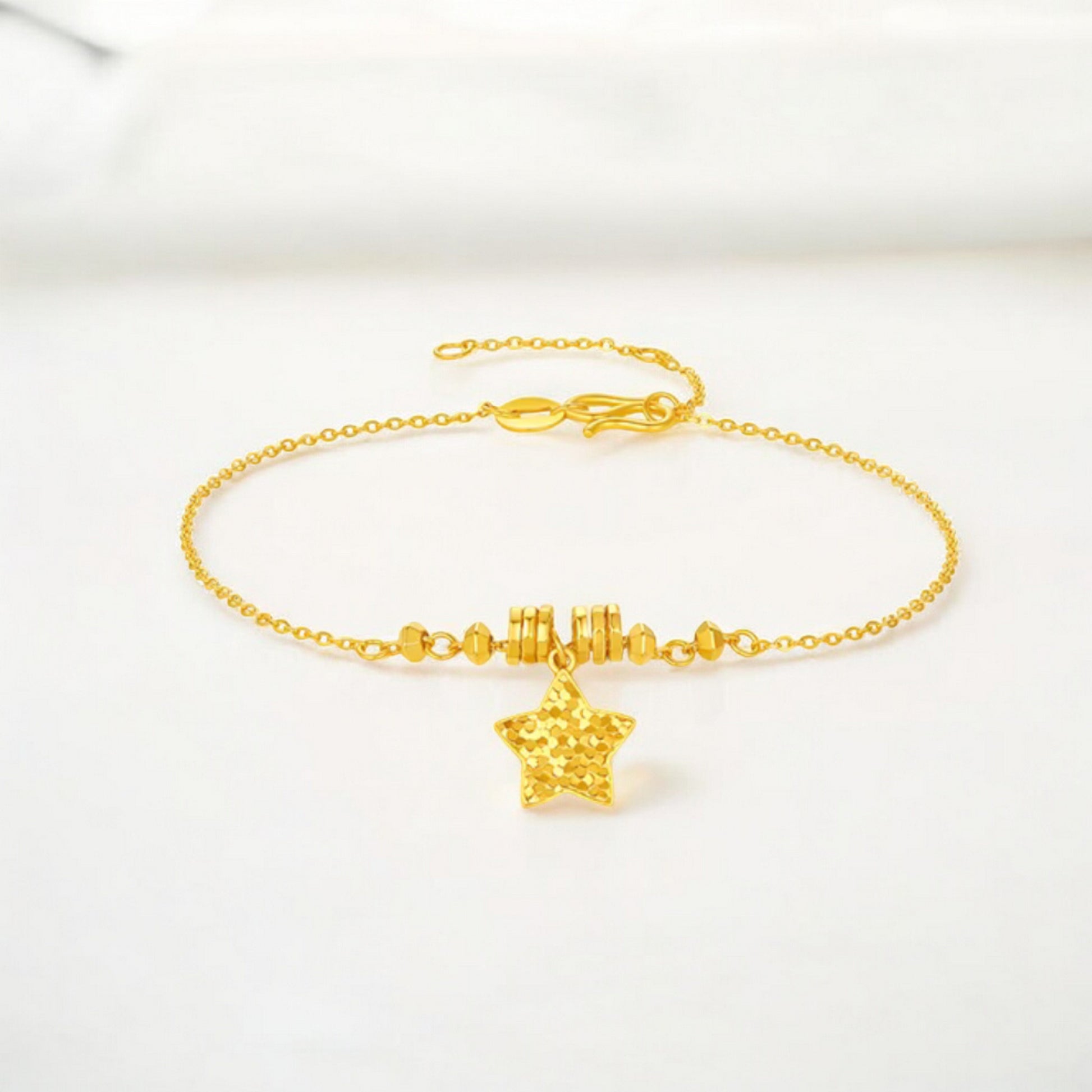 Crafted from authentic 24K gold with 999 purity certification, this charm bracelet showcases a luminous sparkling star pendant that captures light with exceptional brilliance. The substantial gold content ensures lasting durability and maintains its radiant finish through years of wear. The star charm's faceted design creates dynamic sparkle, making it an elegant statement piece suitable for both everyday elegance and special occasions. A timeless investment in fine jewelry that combines precious metal quality with distinctive celestial-inspired design.