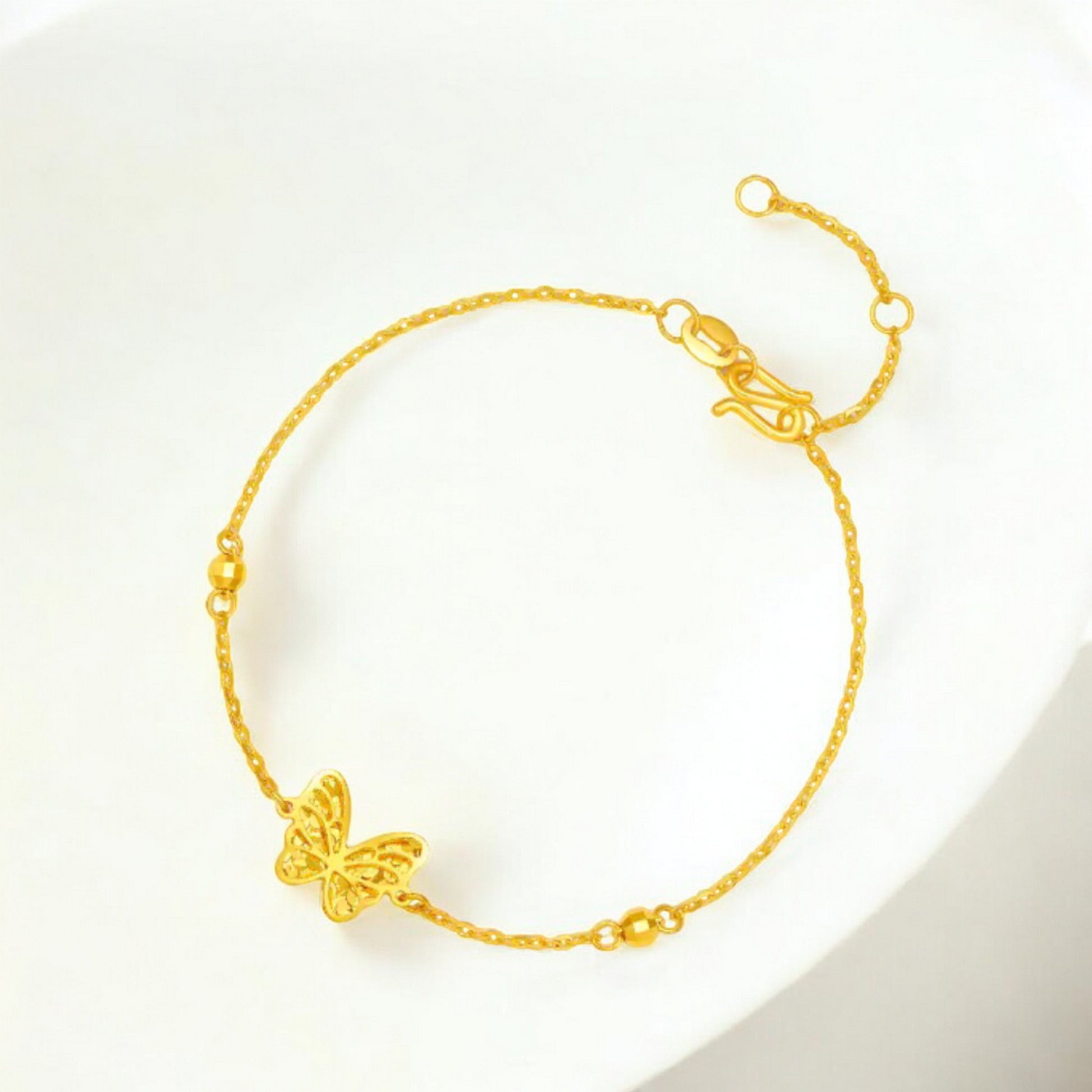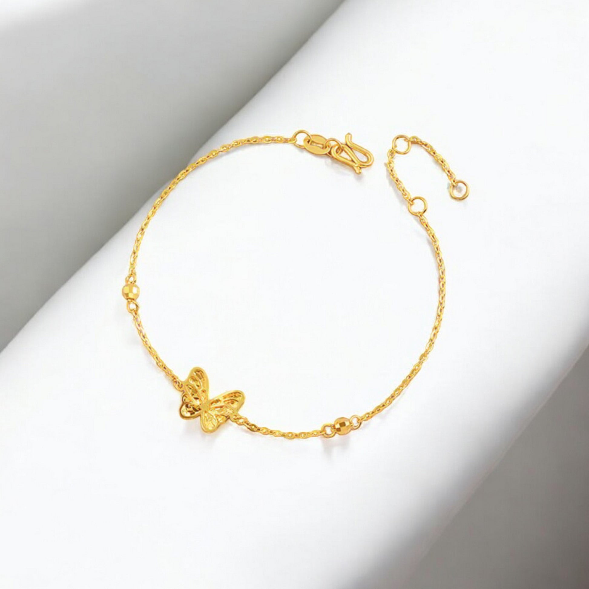 Crafted from authentic 24K gold (999 purity), this exquisite butterfly charm bracelet combines timeless elegance with contemporary design. The delicate butterfly motif features sparkling details that catch light beautifully, making it an ideal choice for those who appreciate fine jewelry. The substantial gold content ensures lasting durability and maintains its lustrous finish for years to come. Perfect as a meaningful gift or personal treasure, this bracelet seamlessly transitions from everyday wear to special occasions, offering versatile sophistication for the discerning collector.