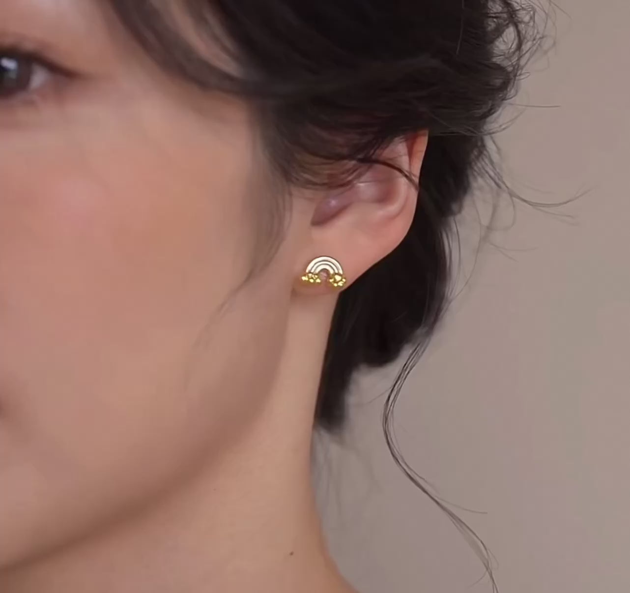 Elevate your style with these 24K real gold asymmetrical stud earrings featuring a playful sun and rainbow design. Crafted with 5D hard gold, they offer exceptional durability while capturing light from every angle, adding dynamic dimension to your look. Perfect for those seeking a unique blend of joyful symbolism and expert craftsmanship in a subtle yet striking accessory.