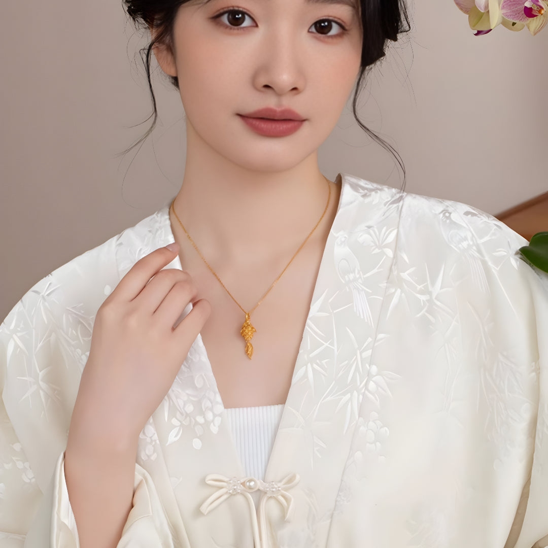 Crafted from genuine 24k gold, this Ruyi Koi Fish Pendant symbolizes prosperity and good fortune. The koi fish design represents strength and perseverance, while the ruyi motif adds an element of auspicious power. Expertly crafted with fine details, this pendant offers both elegance and meaningful symbolism, making it a refined choice for those seeking a blend of luxury and cultural significance.