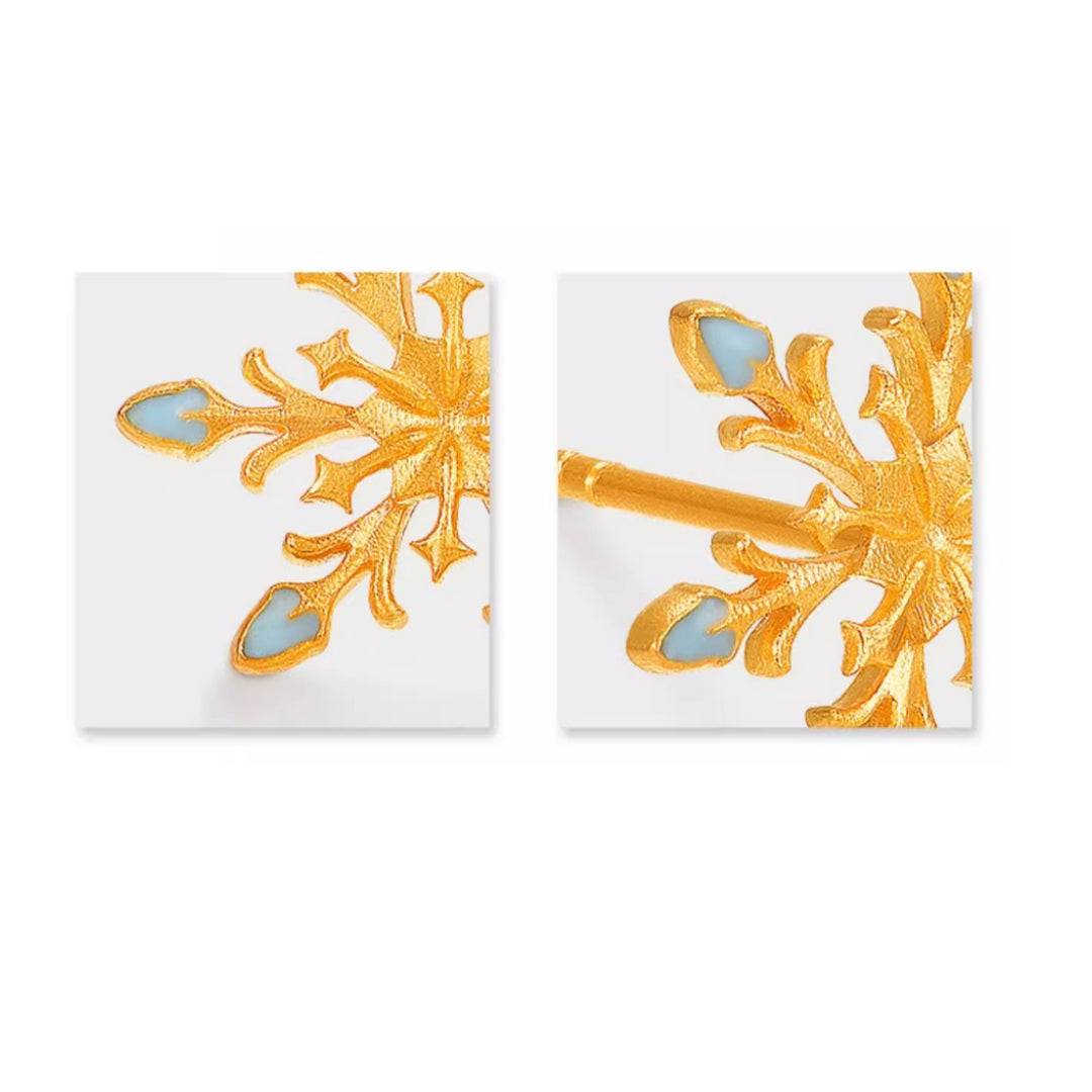 24K Real Gold Snow Snowflake Enamel Stud Earrings Great for Holiday Gift