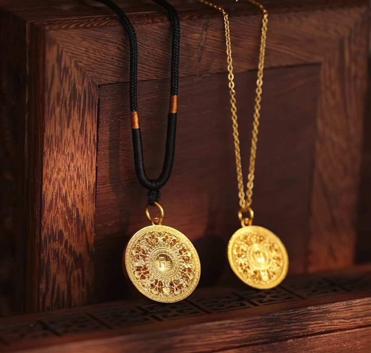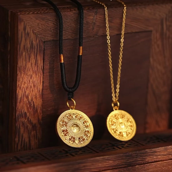 This exquisite 24k solid gold pendant showcases the ancient Eight Treasures of Fortune compass design, symbolizing prosperity and protection. Offered in two sizes and accompanied by a complimentary black rope, it provides a versatile accessory suitable for both men and women. Ideal for couples, this piece blends traditional Chinese symbolism with elegant craftsmanship, making it a meaningful and stylish addition to any collection.