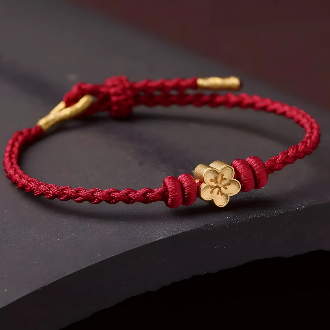 24k Solid 999 Gold Cherry Blossom Flower Red Rope Braided Bracelet