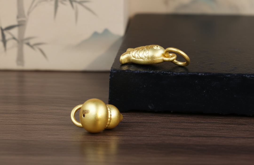 This 24k solid gold pendant features a finely crafted Chinese gourd or small fish design, symbolizing wealth and fortune. Made from 999 pure gold, it serves as a meaningful charm to incorporate into your DIY jewelry projects. Combining traditional symbolism with premium craftsmanship, this pendant offers both aesthetic appeal and cultural significance for those seeking prosperity.